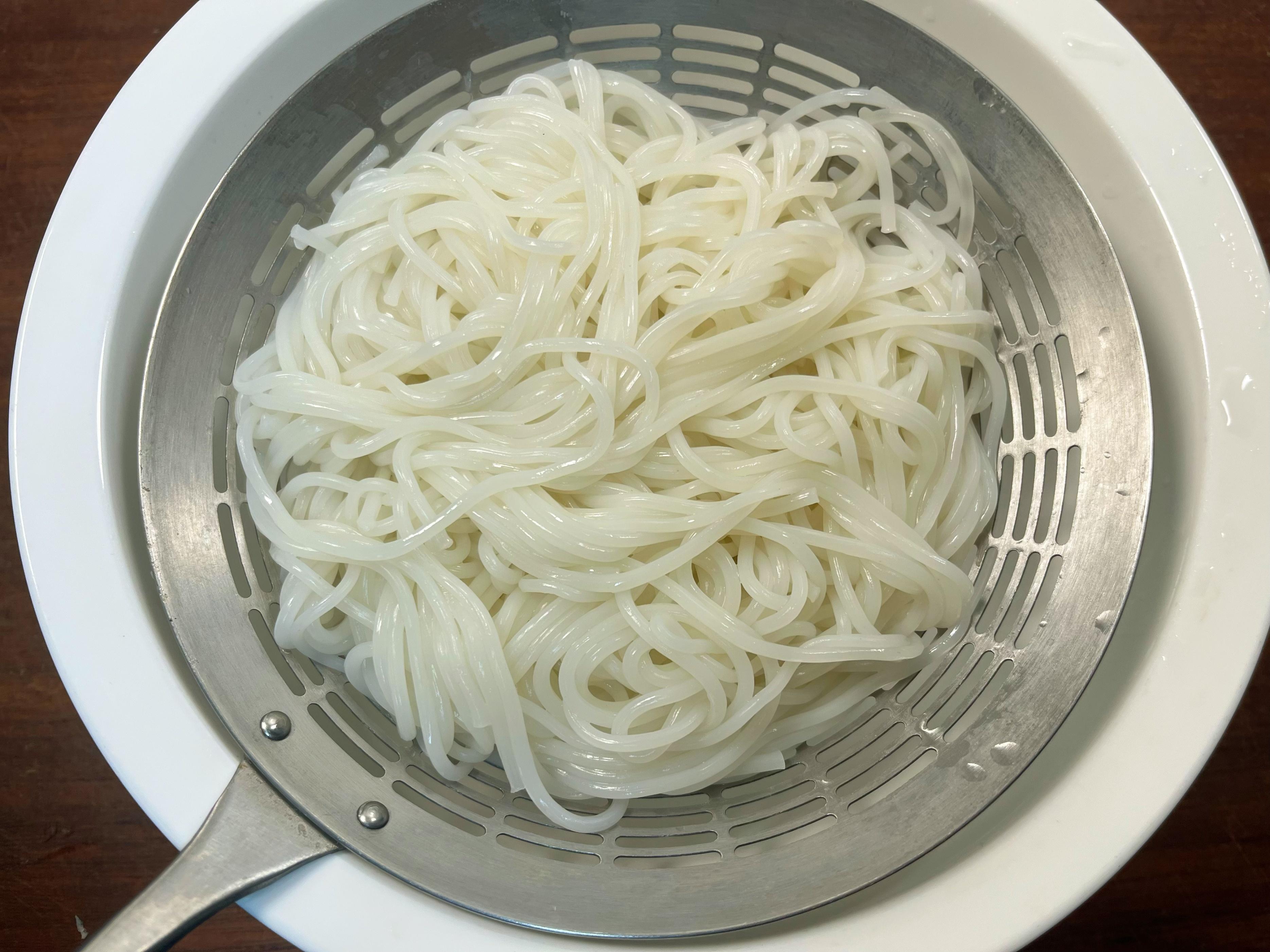 1、泡發準備(幹米粉必備):幹米粉提前用溫水或涼水泡軟,泡到沒硬芯、能輕鬆掐斷,剪成合適長度。新鮮溼米粉省了這步。