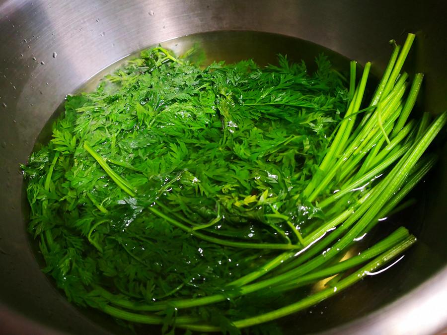 3.胡蘿蔔纓適量洗淨後切去前面較硬口感不好的部分,然後起鍋燒水,水開後少加一點點鹽和食用油,可以使胡蘿蔔纓的顏色保持翠綠。燙至胡蘿蔔纓變色後,迅速撈出放到涼水中過涼,再反覆多衝洗幾遍,攥乾淨水分後切碎剁細。