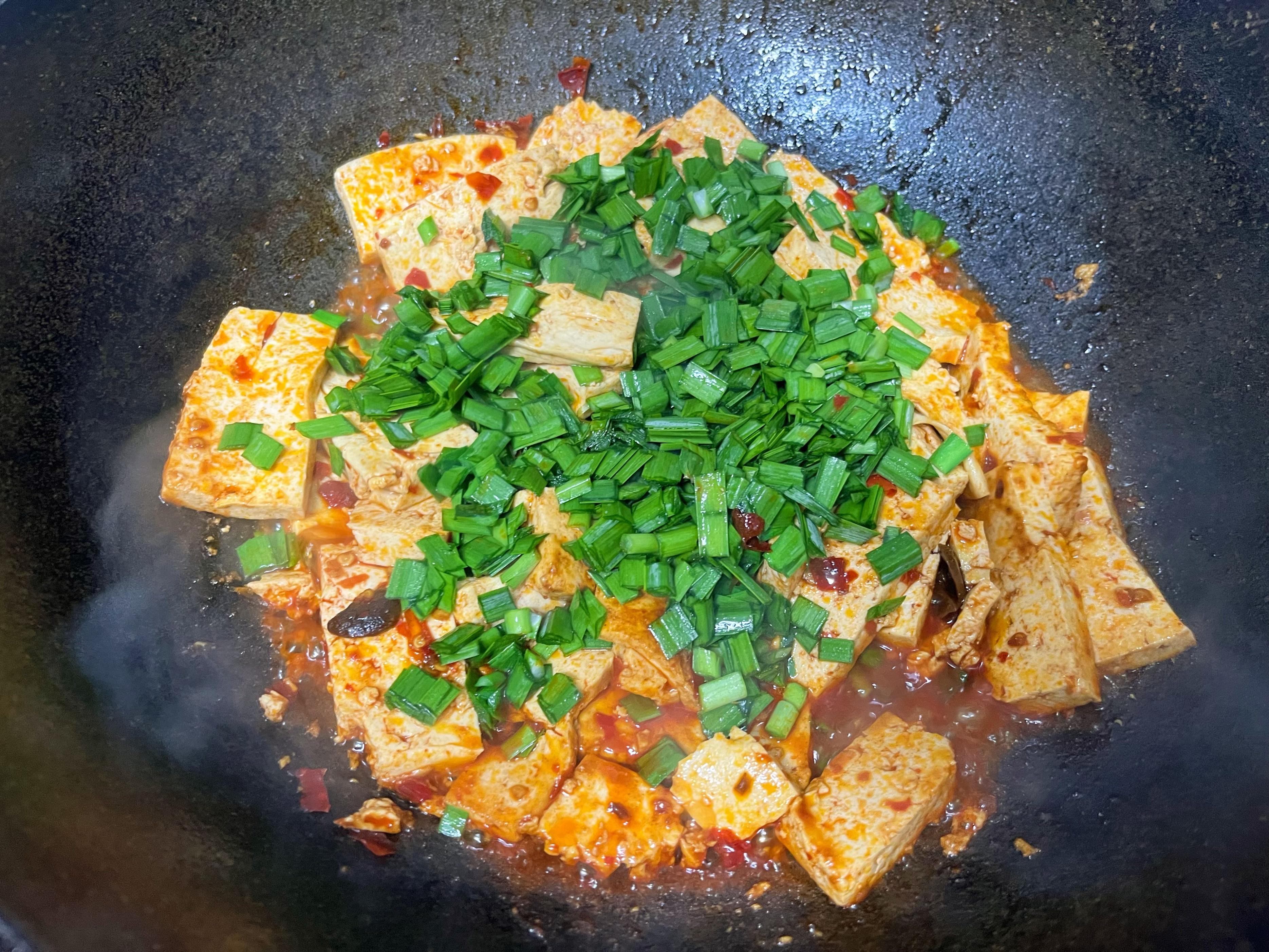 6、瞅準鍋裏的湯汁收得差不多了(留點湯汁拌飯更香),趕緊把切好的翠綠韭菜丁,一股腦兒撒進鍋裏!記住嘍:韭菜最嬌嫩,最怕炒老! 這時候,開大火! 動作要快!眼疾手快!快速翻炒!您就瞅着那翠綠的韭菜丁顏色“唰”地變得更鮮亮、更水靈,也就十幾秒的功夫,一股子韭菜特有的、帶着點衝勁兒的辛鮮香氣“噌”地就竄出來了——立刻關火! 用鍋裏的餘溫,再快速翻拌那麼幾下,讓韭菜和紅潤的豆腐丁混合均勻就成。