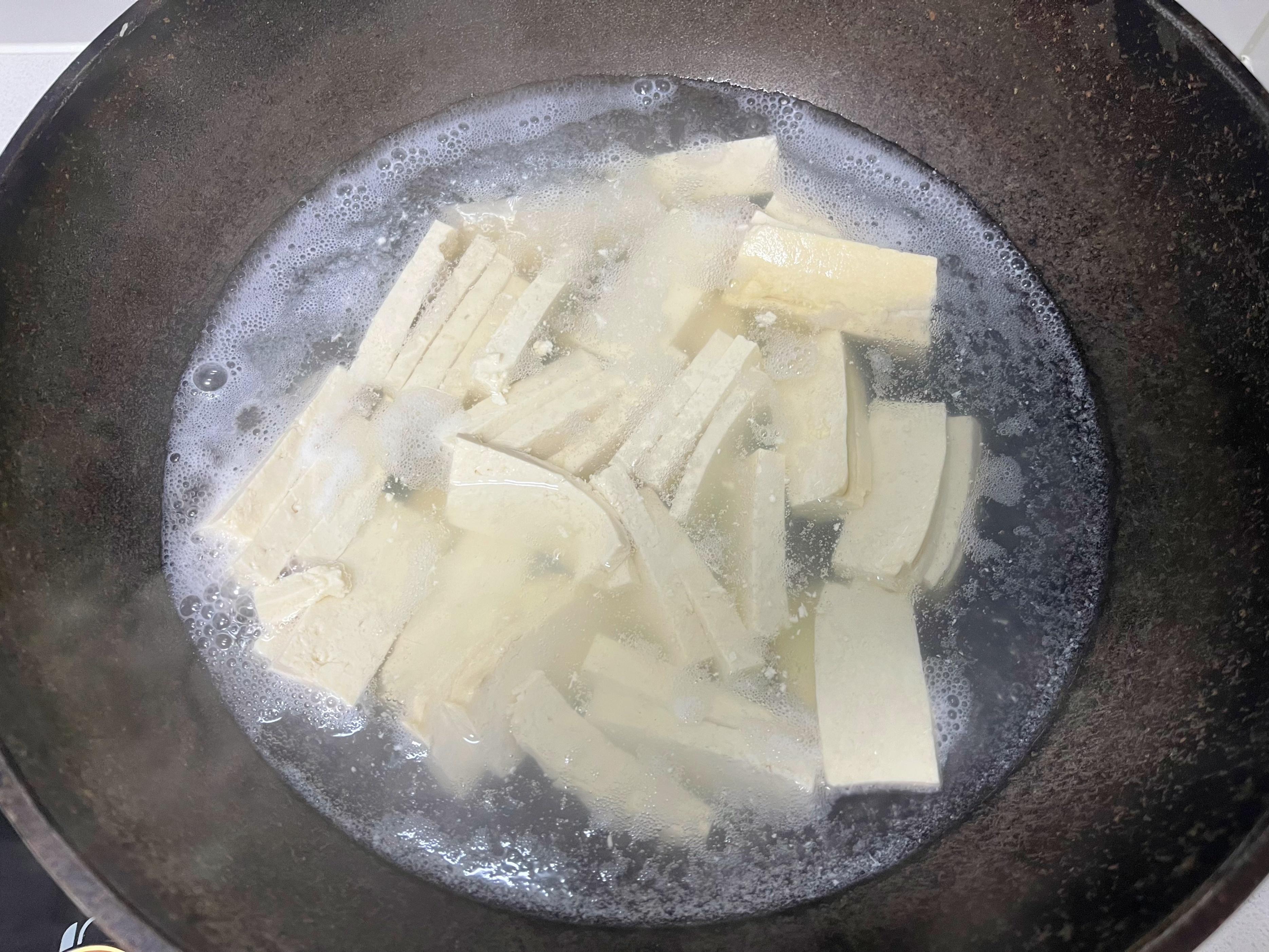 豆腐切成大小的均勻小方塊。 燒一鍋滾開的水,水裏可以滴兩滴油或者放一小勺鹽(豆腐更不易碎),把豆腐丁“嘩啦”倒進去,焯它個1-2分鐘。這一步啊,一是去掉豆腥氣,二是讓豆腐更緊實,後面炒的時候纔不容易爛糊糊。撈出來,一定!一定!要瀝乾水份!