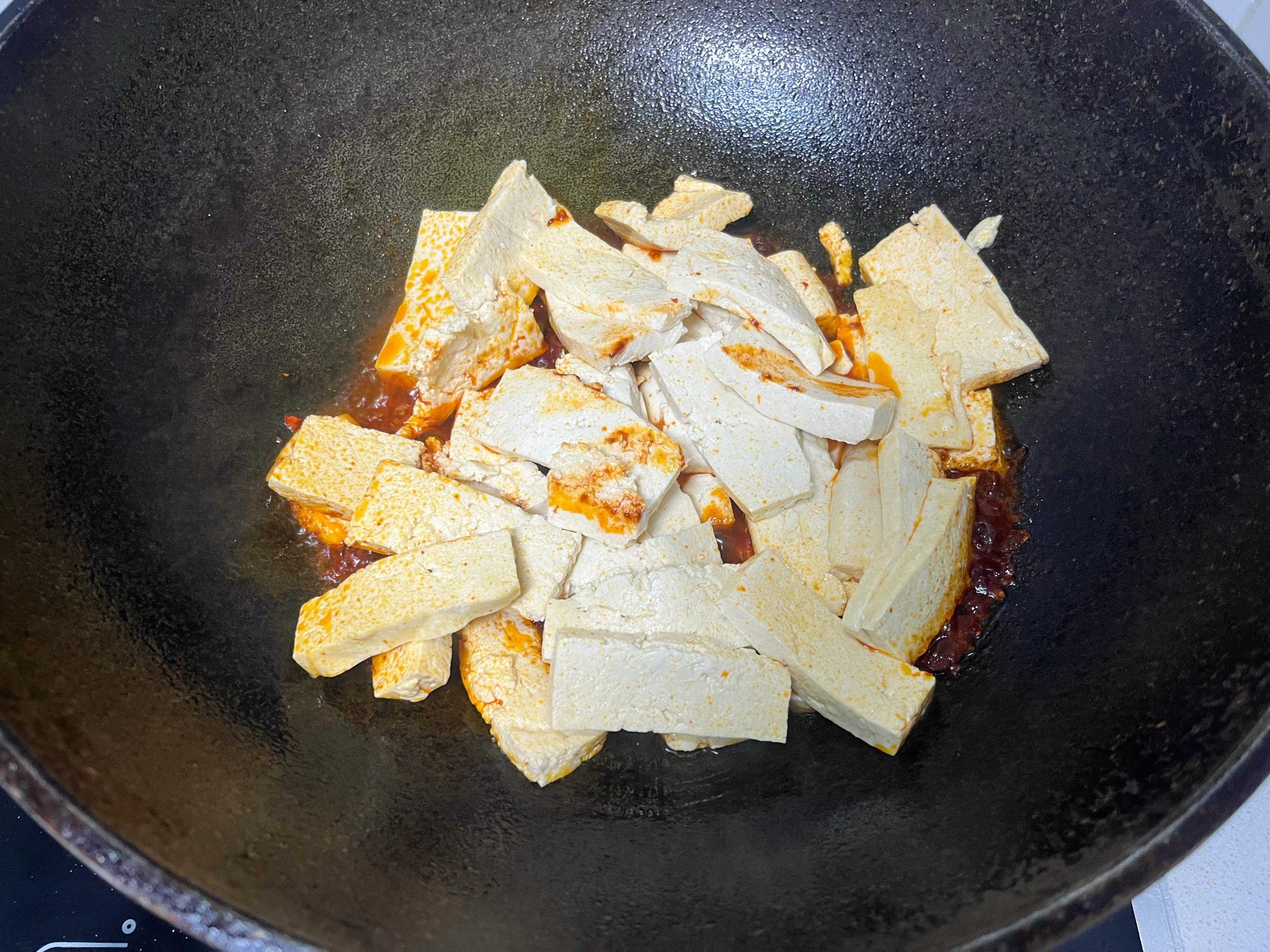 4、鍋燒熱,倒點油進去。油稍微熱一點(別冒大煙),轉成小火! 把蒜末、薑末,還有那一小勺郫縣豆瓣醬,豆瓣醬的香味兒炒得足足的、紅油也亮汪汪的了,趕緊把瀝得乾乾爽爽的焯水豆腐丁倒進鍋裏。轉成中大火! 麻利兒地翻炒,讓每一塊白嫩的豆腐都均勻地裹上那層紅亮誘人的醬汁。豆腐本身焯過水是熟的,主要就是讓它吸味兒、上色,翻炒個一分鐘左右就差不多了,這時候廚房已經香得不行了!