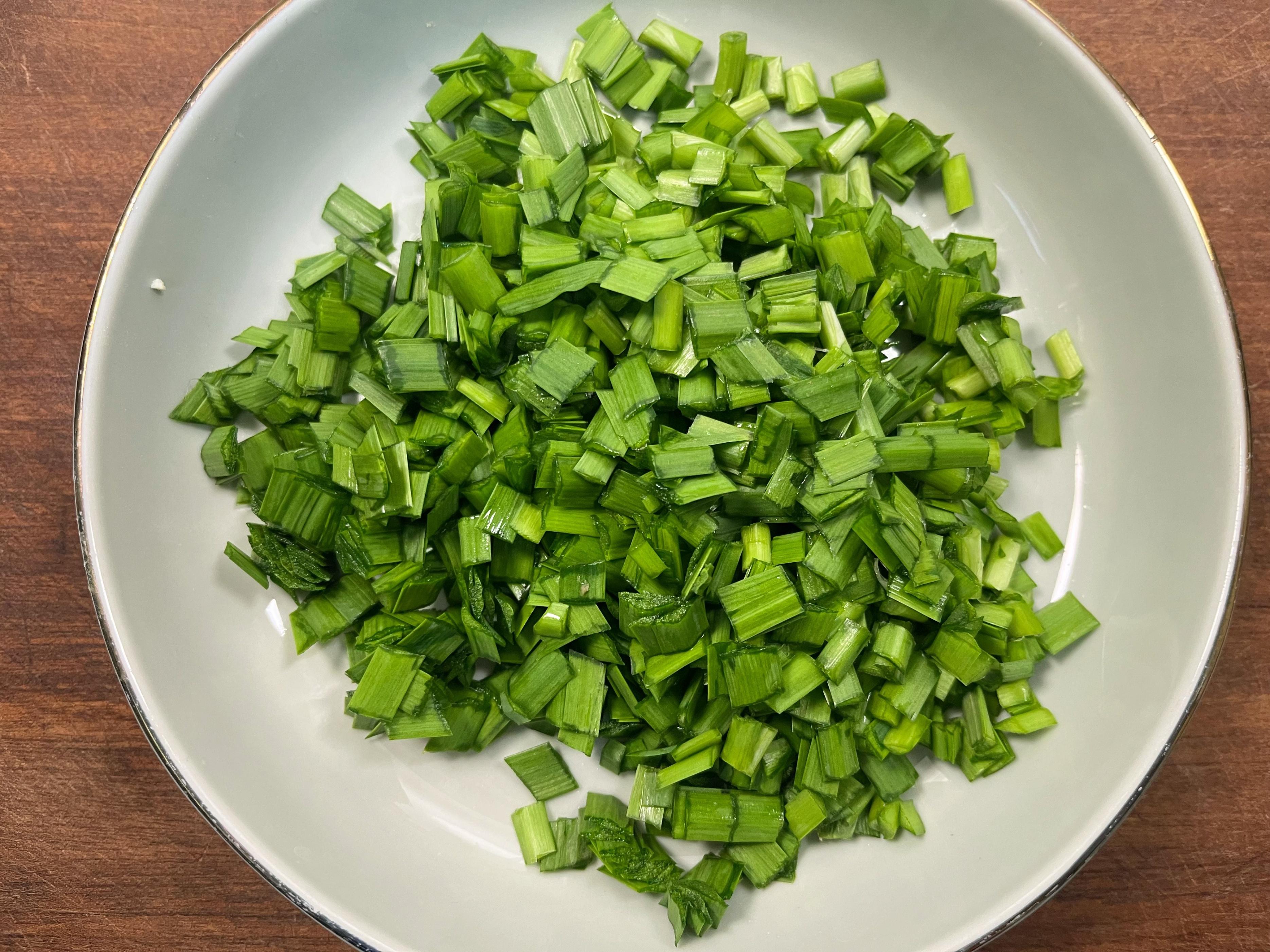 2 挑新鮮翠綠的韭菜,洗乾淨,尤其根部容易藏泥。甩幹水珠(或者輕輕抖一抖),切成細細碎碎的小丁丁,那顏色,翠綠翠綠的,看着就提神!