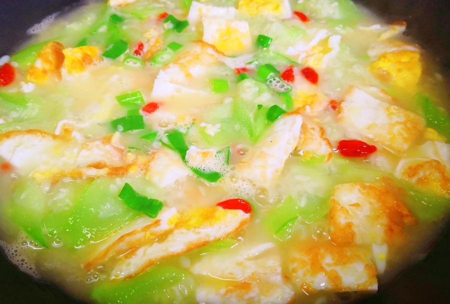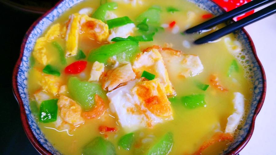 製作方法:絲瓜洗淨去皮後切成滾刀塊,3個雞蛋打到碗裏,不需要打散,油熱下入雞蛋,開小火給它煎至兩面金黃,最好是微微發焦的狀態,然後倒出晾涼後切成3~4公分大小的塊,放一邊備用;起鍋加油,油溫五成熱下入適量薑絲和蒜末,炒出香味後,再將瀝乾水分的絲瓜塊倒入,大火翻炒一會兒,炒至絲瓜變軟後,再放入之前煎好的雞蛋塊,加入滾燙的開水,接着開始調味:加入適量的食鹽、雞精、胡椒粉,然後撒入一把幹蝦仁,攪拌均勻後煮1分鐘,出鍋前再淋入香油即可。