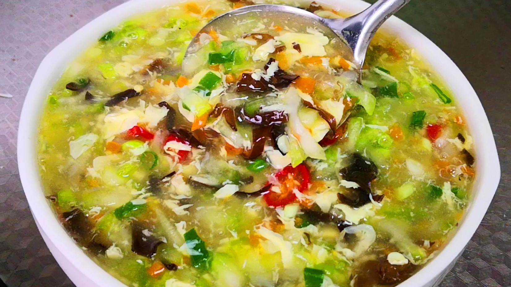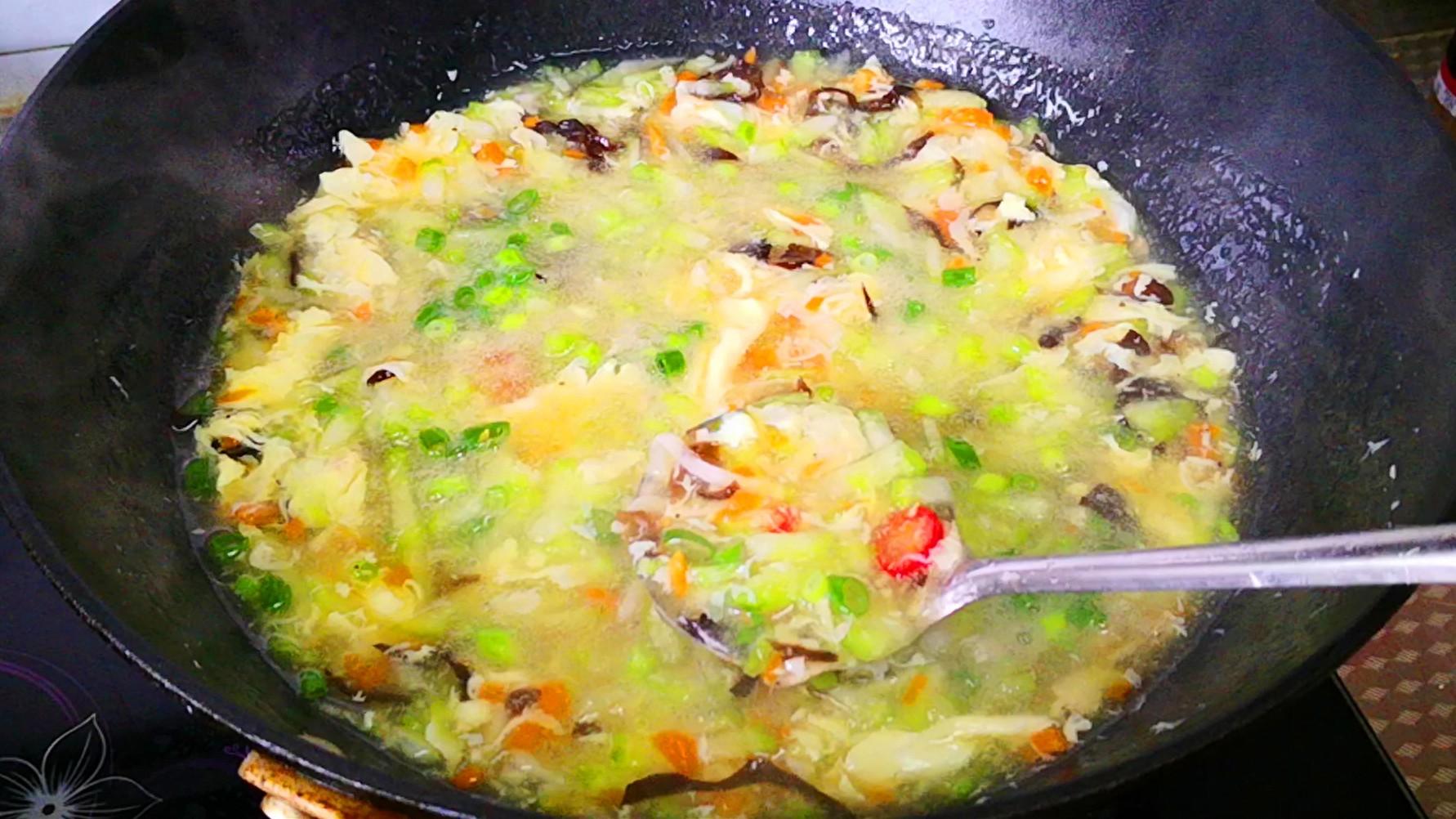 製作方法:冬瓜去皮去瓤後切成丁,木耳泡發後切細,胡蘿蔔切成丁,3根小香蔥切成蔥花,小米椒1個切成圈,雞蛋打散備用;起鍋加水,水開後加入冬瓜、胡蘿蔔丁和木耳,大火燒開以後倒入適量的水澱粉勾芡,湯汁變濃稠後改小火,用筷子貼着碗邊均勻淋入打散的蛋液,蛋液凝固後再轉中火,加入1 小把的蝦皮,攪拌均勻後再調一下味:加入適量鹽,胡椒粉,雞粉,少許的味極鮮,將調料攪拌至融化以後再加入切好的小米椒的蔥花,再次攪拌均勻後關火出鍋。