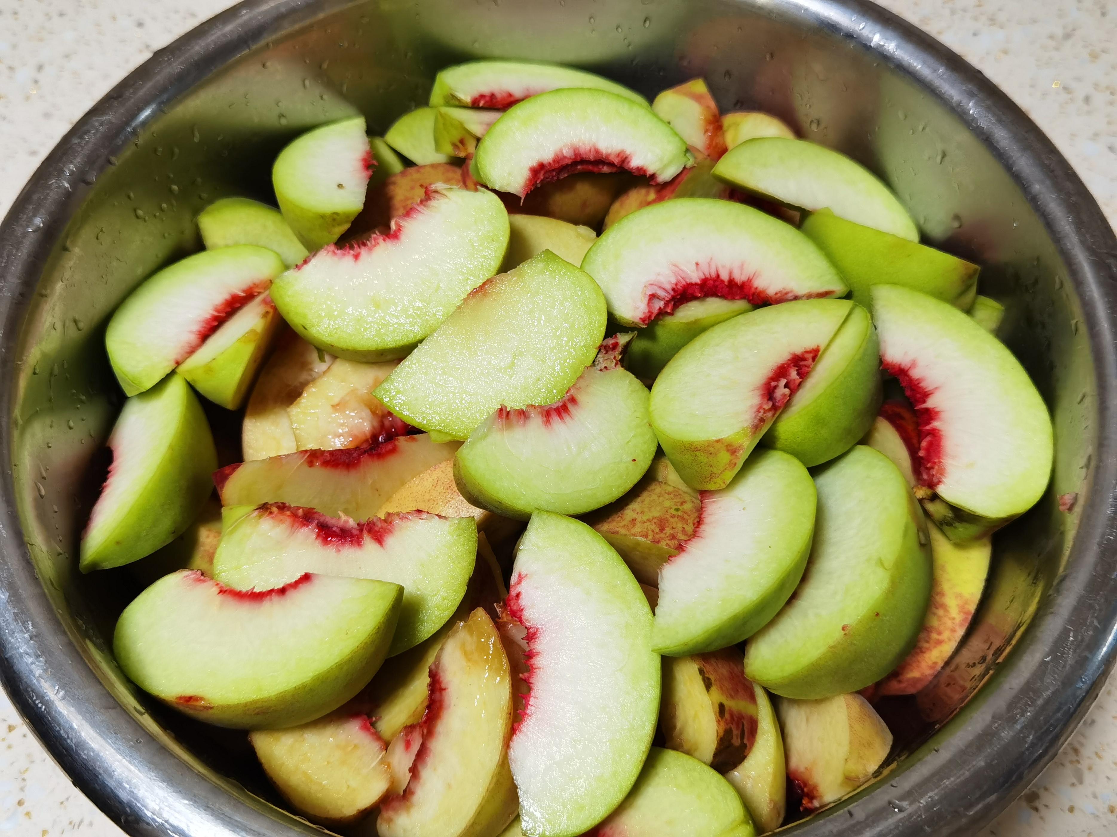 1、挑硬實點、沒軟透的桃子,洗乾淨。削掉外皮(毛茸茸的喫着不舒服)。豎着對半切開,挖掉桃核。然後把桃肉切成厚薄均勻的片(大概半釐米厚),或者你喜歡的小塊。