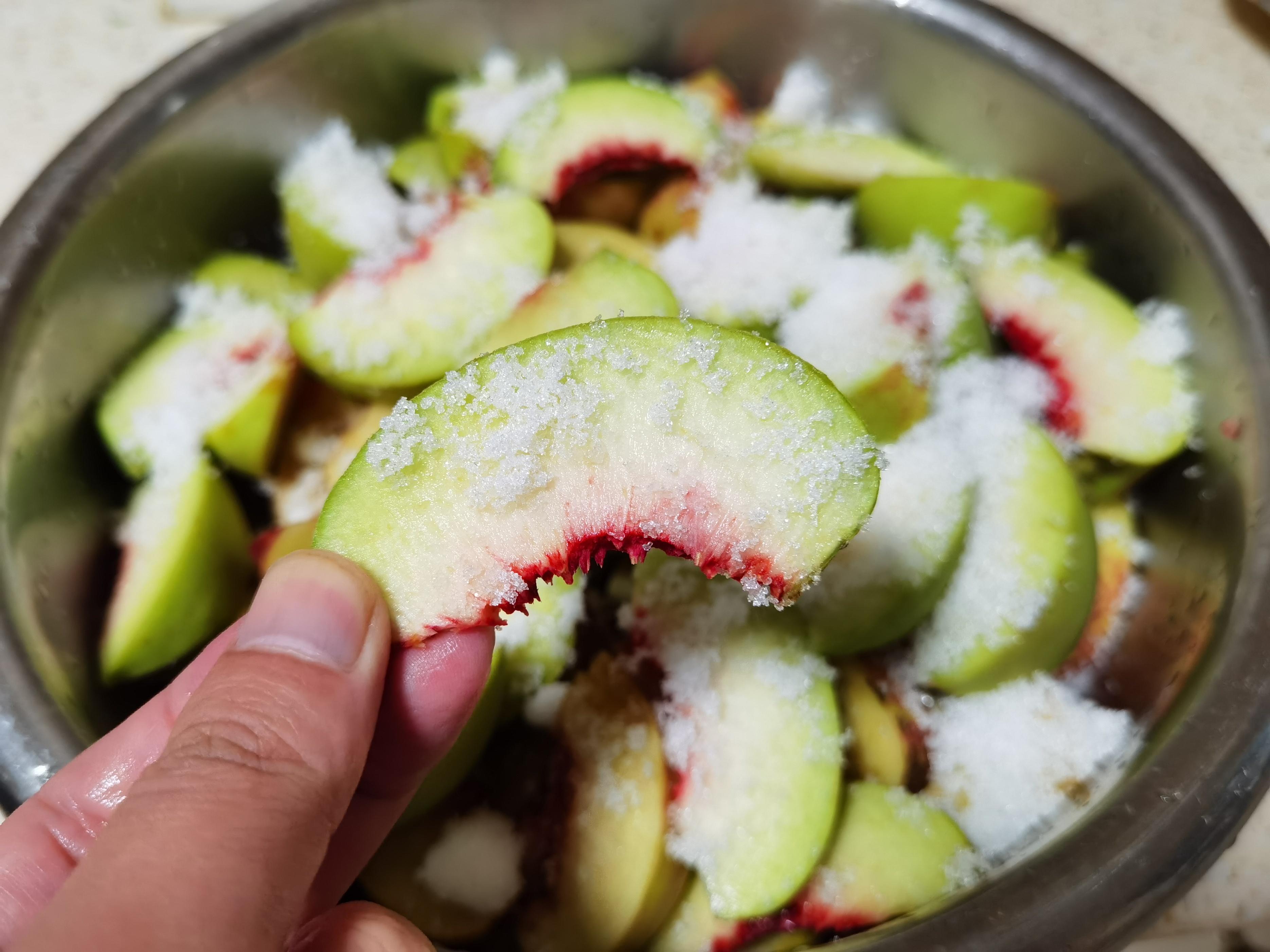 2、切好的桃片容易發黑?別急!準備一大碗清水,擠進去半個檸檬的汁水(或者倒點白醋也行),攪勻。把桃片放進去泡個5-10分鐘澡,撈出來瀝乾水分。喜歡甜點的,可以在瀝乾後薄薄撒一層白糖,稍微醃個半小時,會出點汁水,糖漬過風味更濃(這步嫌麻煩也可以省)。