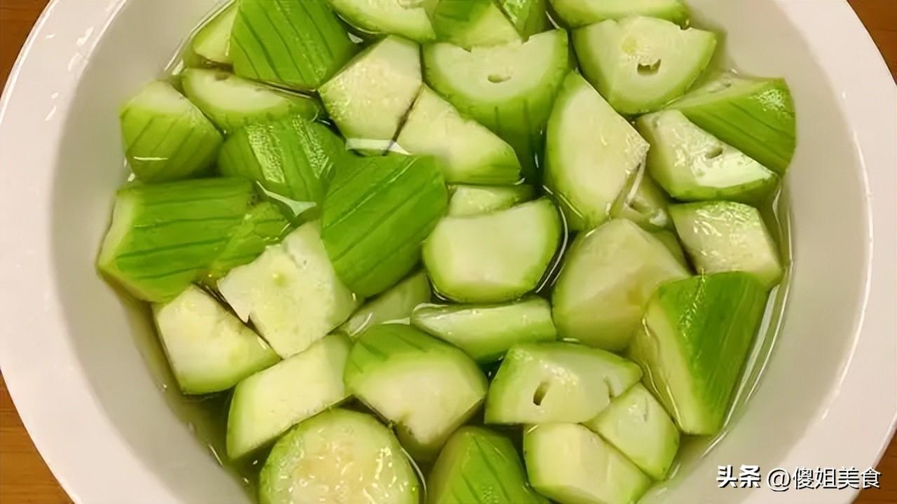 【具體做法】1、刀刃斜着刮掉絲瓜外面那層老皮(別用削皮器,削厚了浪費!),切滾刀塊或厚片。切好立刻下鍋,千萬別泡水等,不然鮮味都跑光啦!
