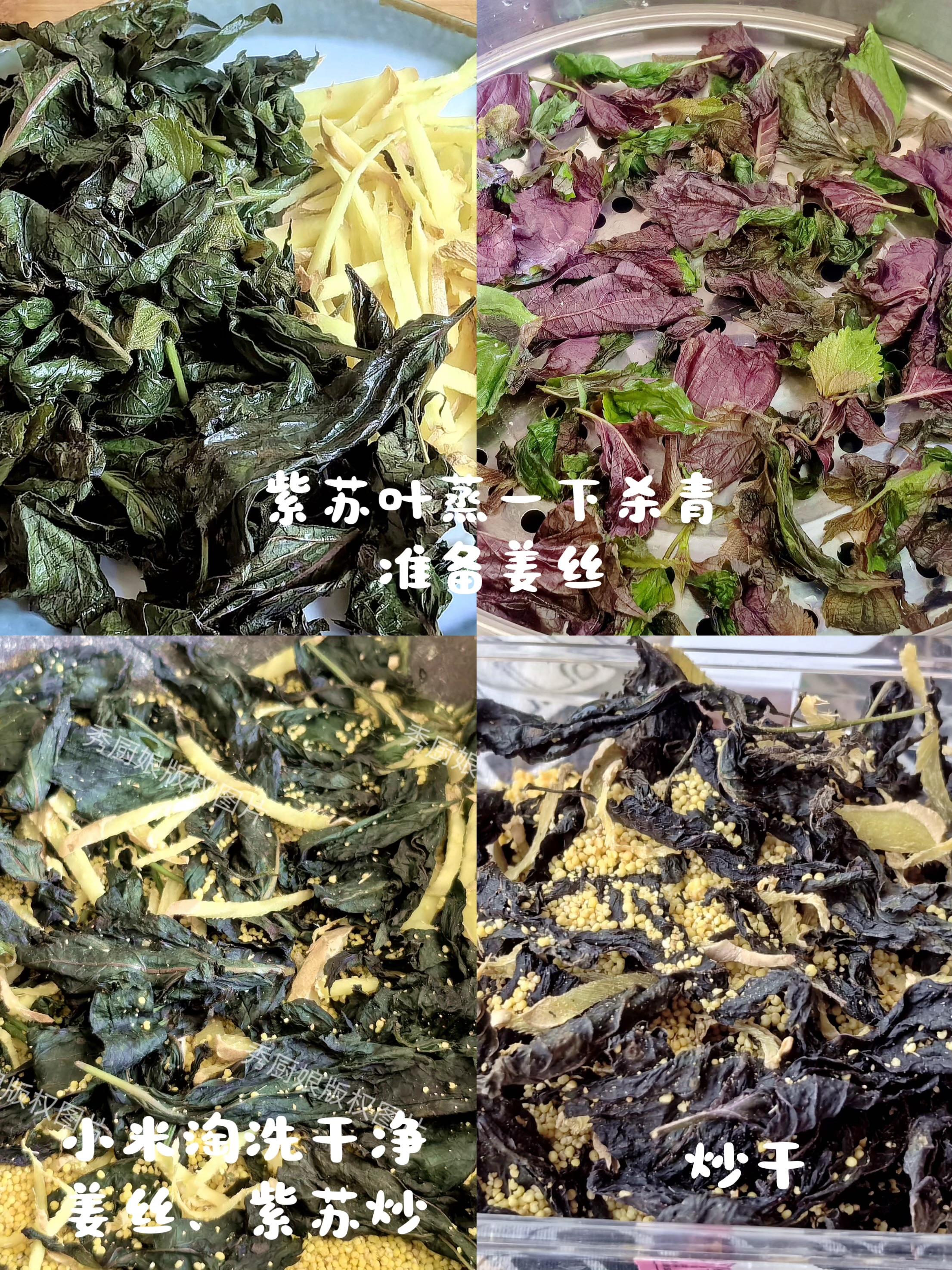 4、把生薑切成細絲(約20克),加入炒香的小米中,繼續翻炒,讓姜的辛辣味慢慢融入。最後加入處理好的紫蘇葉,一起翻炒。這時火可以調小一點,耐心炒,直到紫蘇葉完全變幹、變脆,捏一下能碎,薑絲也變幹即可關火。