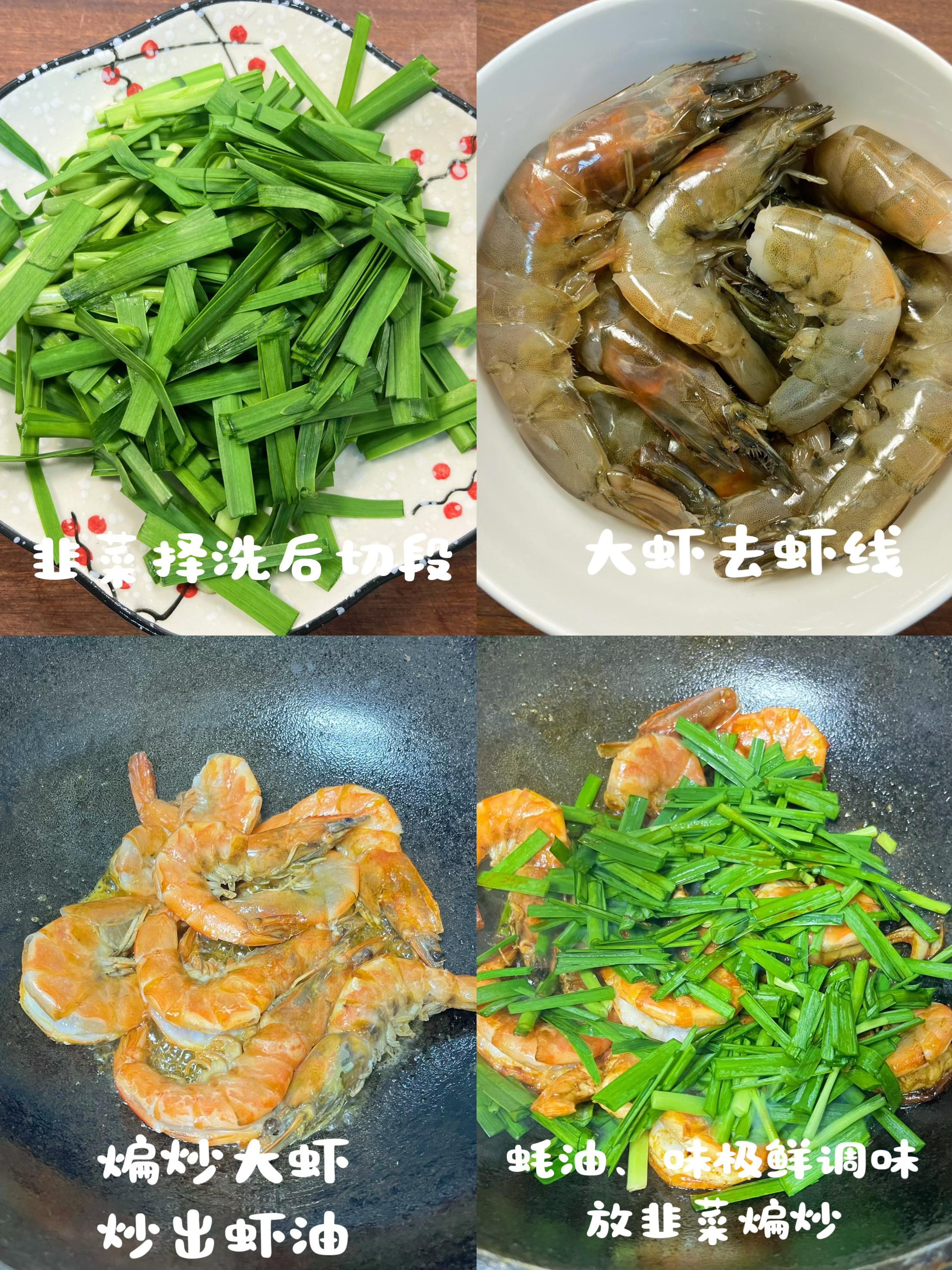 1、鮮蝦去頭(蝦頭別扔,可以炸蝦油或者煮湯提鮮)、去殼、開背去蝦線,洗淨瀝乾,可以用少許料酒和白胡椒粉抓醃一下去腥。韭菜洗淨,切成長段(根部和葉子可以稍微分開放)。
