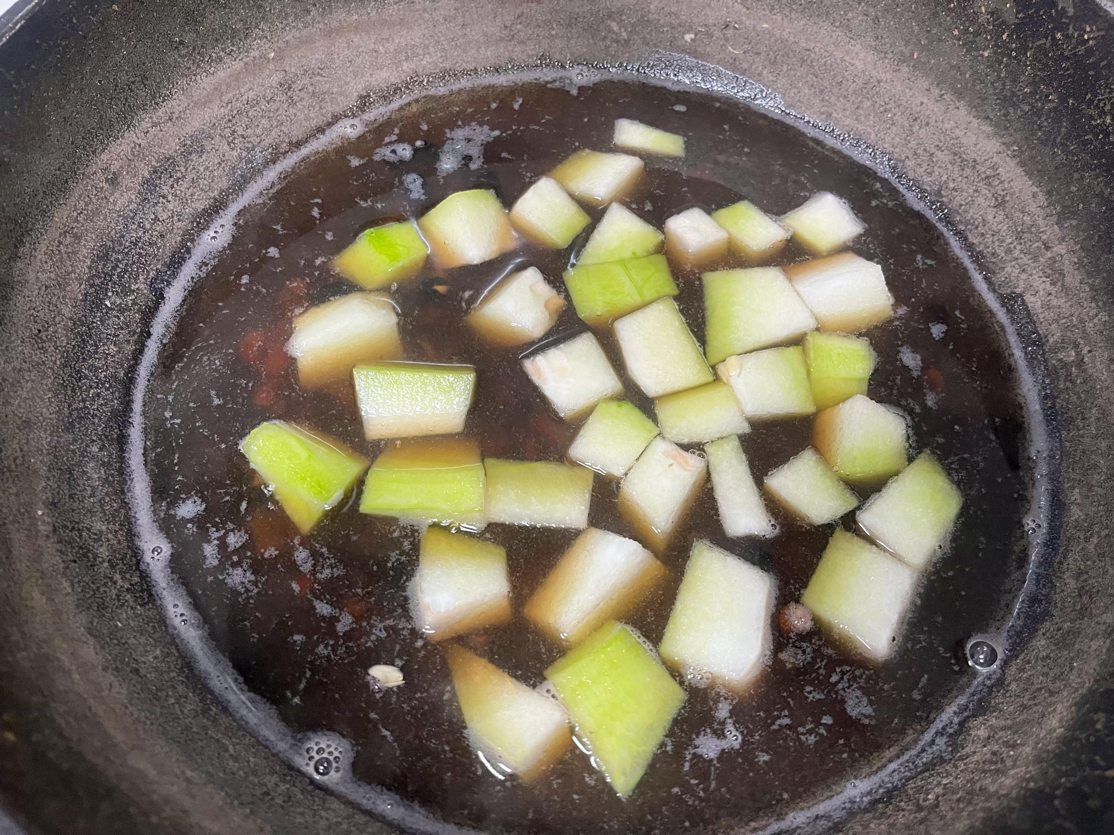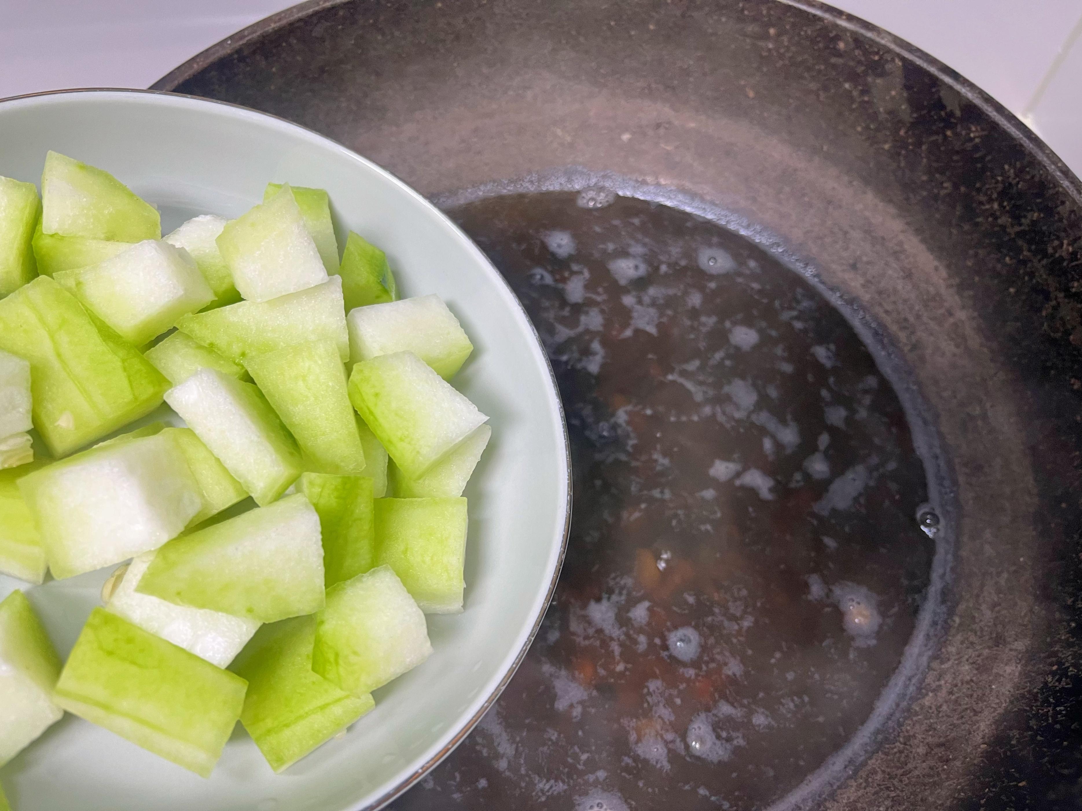 4、待鍋中豆米漸漸軟糯,粥湯初顯稠滑之態時,投入切好的冬瓜丁。冬瓜易熟,且自帶豐沛汁水,太早加入易化於無形。冬瓜入鍋後,繼續小火燜煮約15-20分鐘,直至冬瓜塊變得晶瑩透亮,用勺背輕壓即軟。
