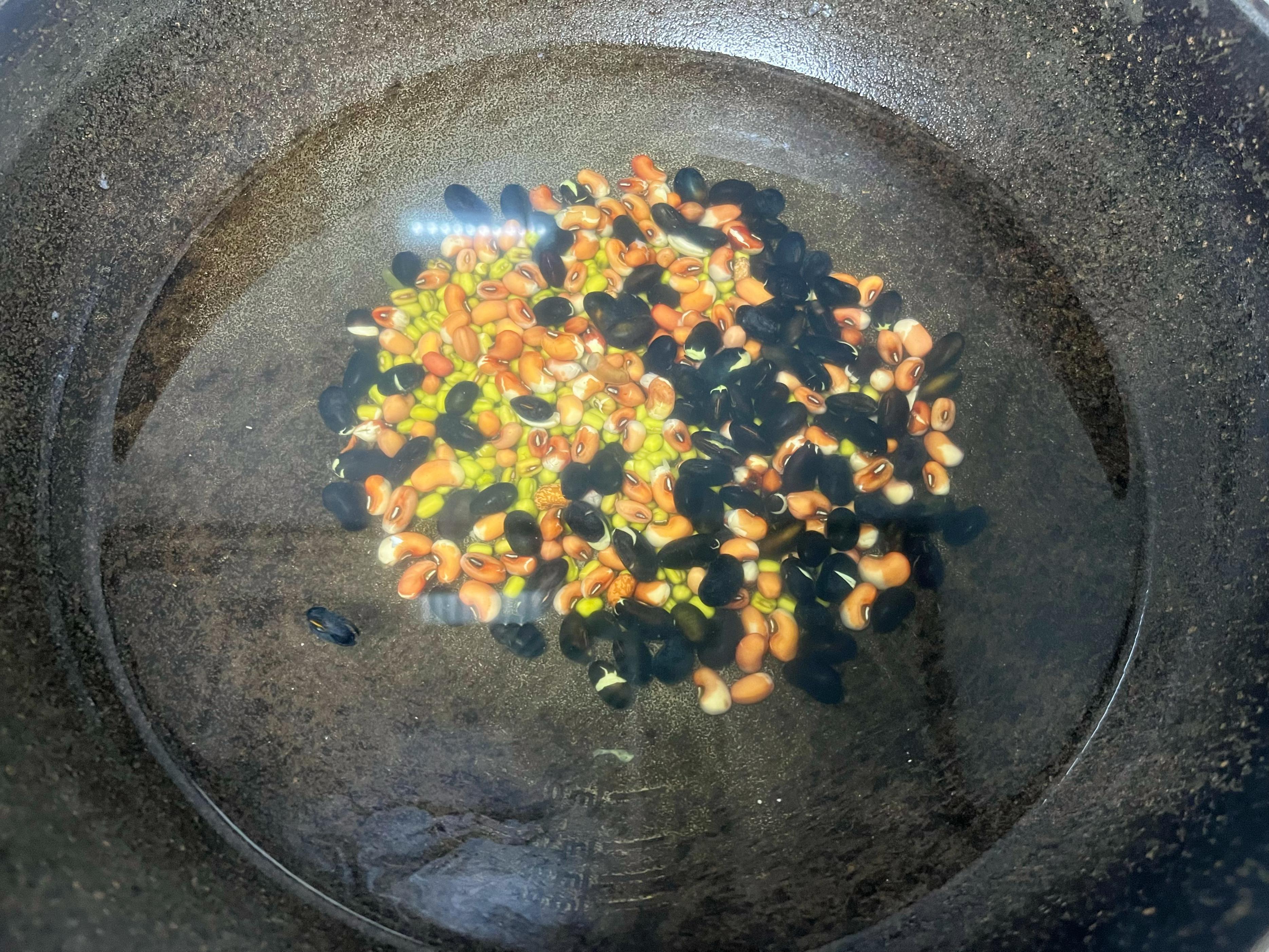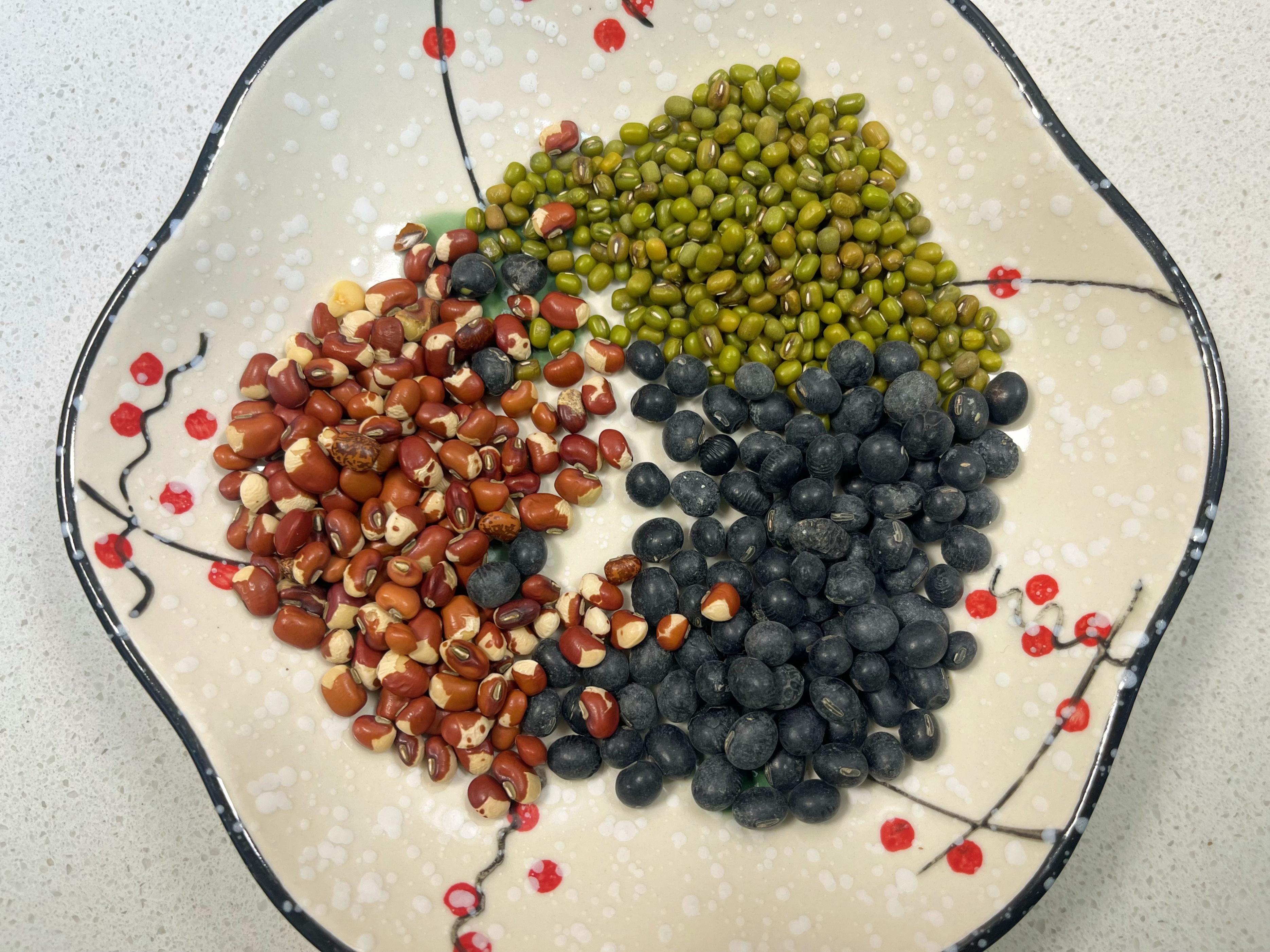 1、綠豆、黑豆、花豇豆先用清水淘洗兩三遍,洗去浮塵。找個大碗,加入足量清水,將這三豆夥伴浸泡至少2小時,甚至隔夜更佳。黑豆和花豇豆尤其需要時間軟化,這樣煮時才易開花出沙。