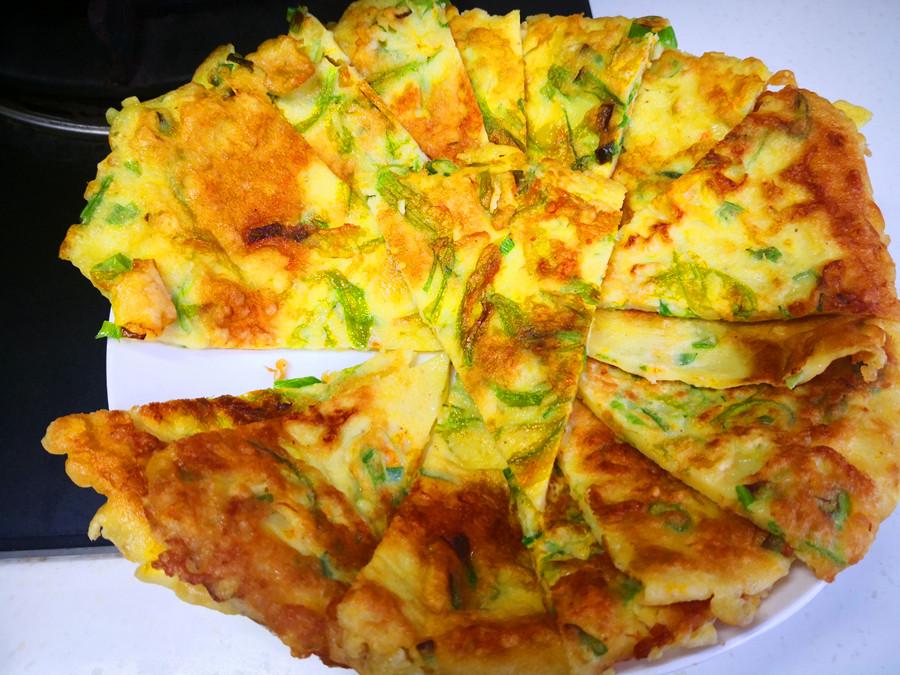 3.熱鍋加油,倒入調好的麪糊,用鏟子慢慢攤薄攤平,烙至一面金黃後翻面再烙,烙至兩面都呈金黃色後關火,盛出裝盤,美味即成!