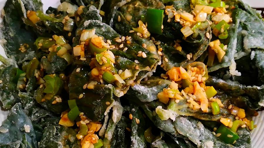 5.大約蒸5分鐘後開鍋,將蒸好的紅薯葉取出裝盤,然後倒入調好的涼拌汁,攪拌均勻後就可以開喫了。