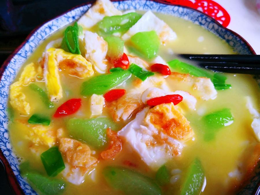 3.鍋留底油,下入蒜末和薑絲,炒香後再下入控水撈出的絲瓜塊,大火翻炒至絲瓜變軟,然後加入一大碗開水,接着倒入雞蛋塊。加入適量的鹽和胡椒粉,攪勻後煮1分鐘。