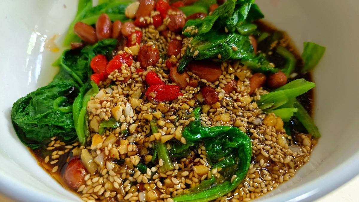 2.取一把花生米洗淨後,下鍋炒熟炒香,盛出晾涼後倒入生菜中;適量的枸杞用溫水泡軟後,也放到生菜中,做配色用。