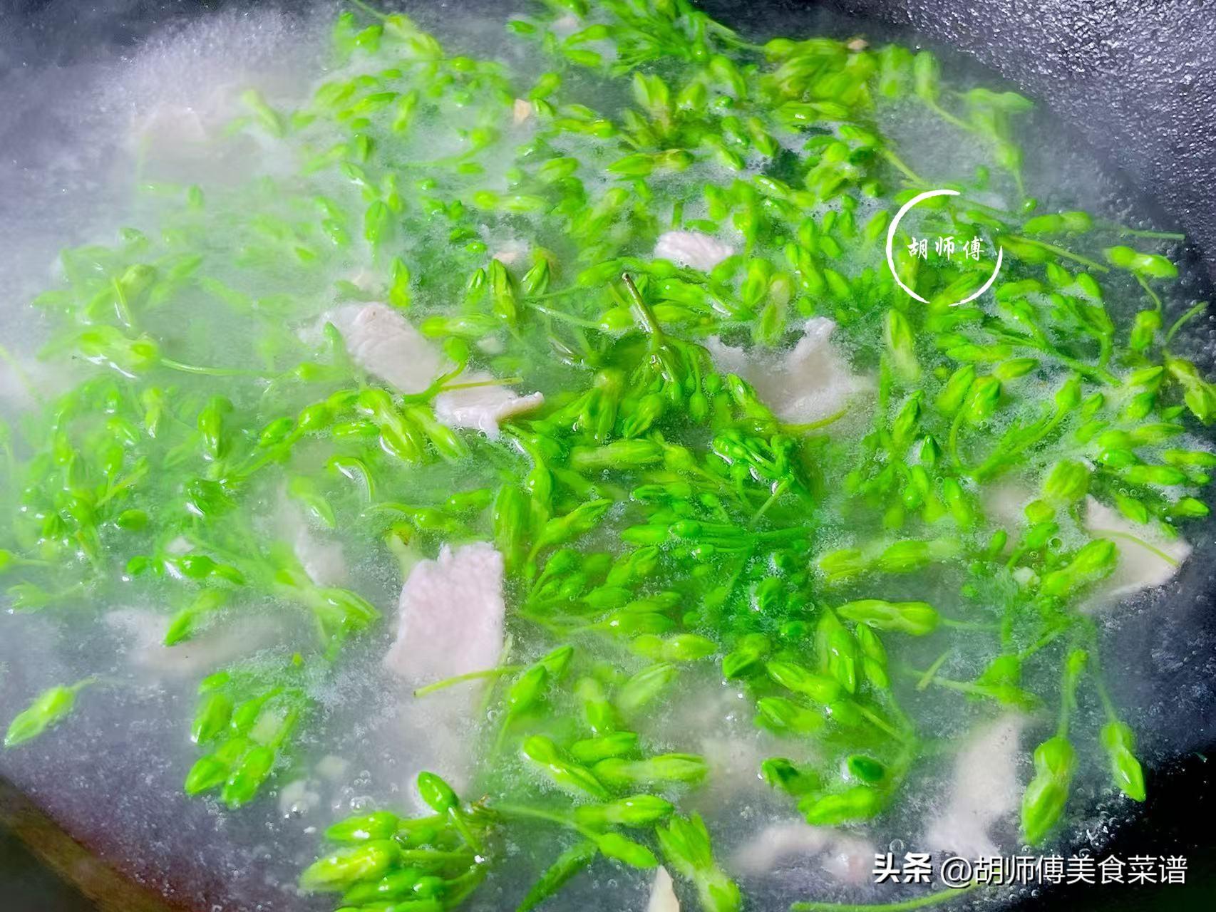 第五步:放入一碗熱水到鍋中,等水煮沸後,將夜來香放入鍋中,大火煮半分鐘後,再把肉片放入鍋中,繼續大火煮1分鐘左右,直到將肉片煮的斷生。
