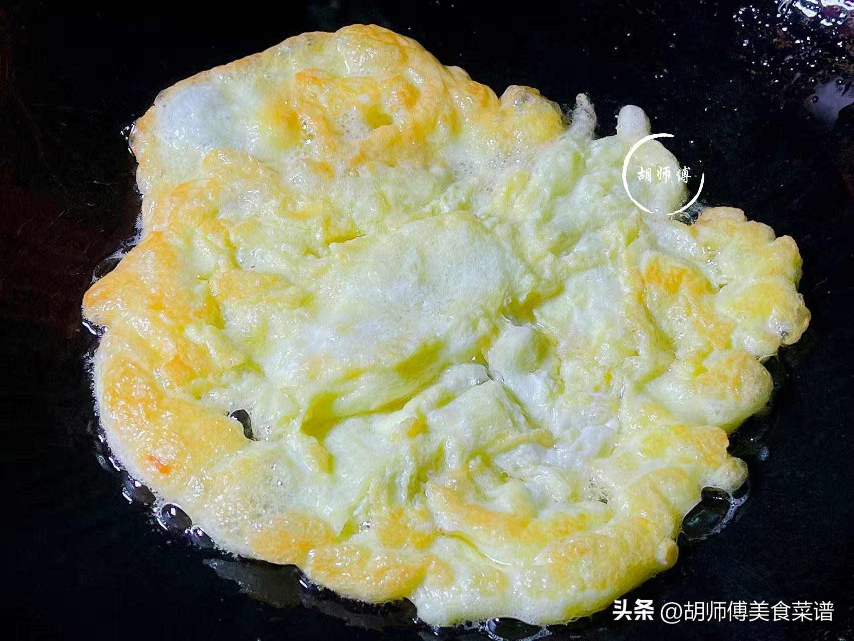 第四步:將鍋燒熱後放入一勺油到鍋中,等油燒熱後,把蛋液放入鍋中,大火將雞蛋煎的兩面金黃色即可撈出備用。