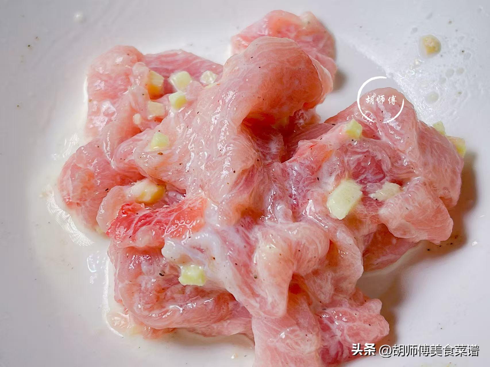 第二步:將瘦肉洗淨後切成薄片,然後將少許食鹽、紅薯水澱粉、胡椒粉、薑末放入肉片中攪拌均勻,接着將3滴香油放入肉中攪拌均勻,加香油不僅能使肉喫着更香,而且還能使肉喫着更嫩。