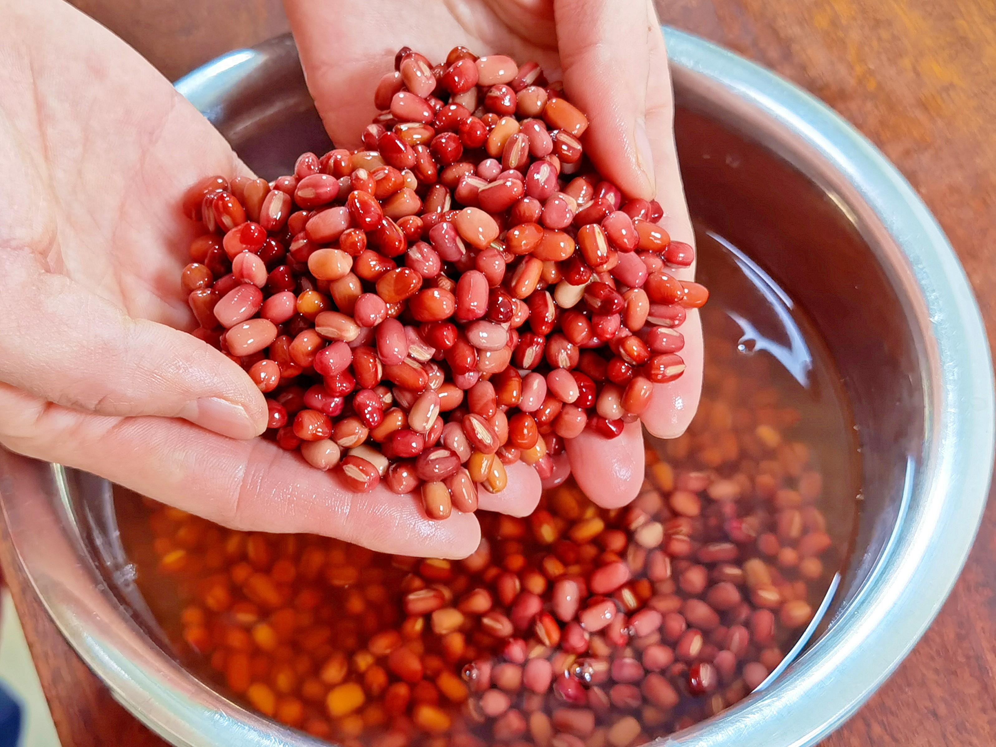 1. 處理紅豆:泡好的紅豆放入小鍋,加少量水煮熟至軟糯但還保持形狀(大約20-30分鐘),撈出瀝乾水分備用。(省時法:直接用前面煮好的紅豆沙裏的熟紅豆粒)。