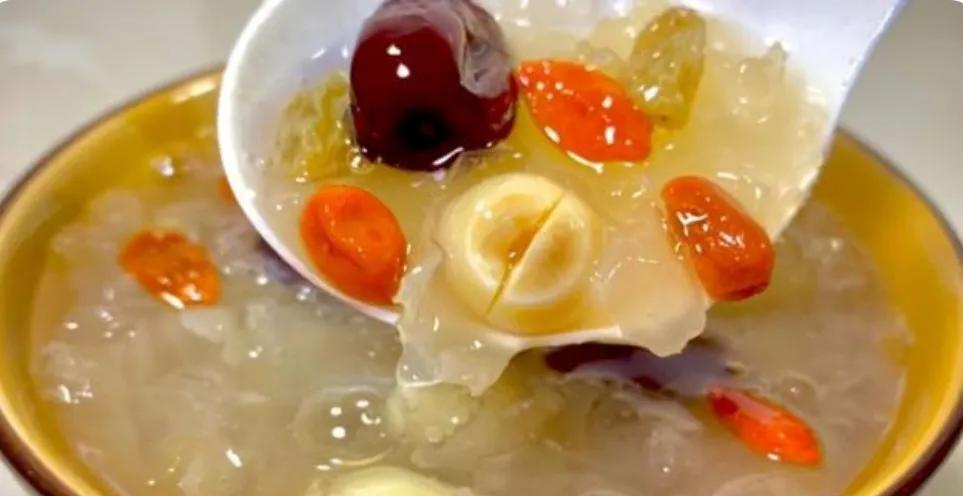 2、把銀耳、蓮子和大棗倒入砂鍋中,倒入適量的清水,沒過所有的食材,再倒入適量的冰糖,大火熬開以後,用湯勺撇去上面的浮沫。浮沫撇乾淨以後,蓋上鍋蓋,用小火燜煮40分鐘,湯汁越來越濃稠。接下來把葡萄乾和枸杞加入進來攪拌均勻,再次熬煮五分鐘,銀耳蓮子羹就熬好了。