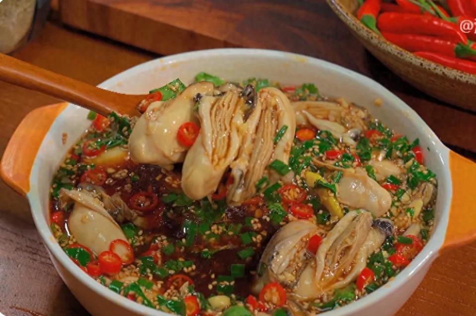 3、生蠔肉燜熟後,撈起來過一遍涼白開,再撈起來瀝乾水分放入撈汁中,攪拌均勻浸泡入味即可開喫。