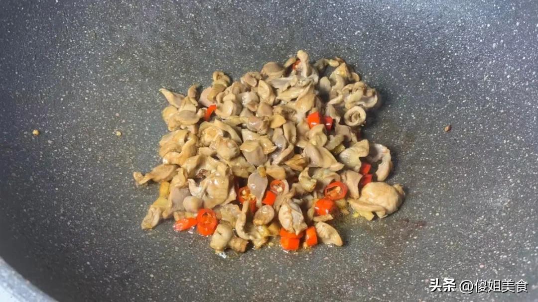 2、熱鍋冷油,爆香開道:鍋裏油燒熱,先扔薑絲、蔥花、小米辣圈進去,"滋啦"一聲,香味瞬間爆炸,廚房立馬有了靈魂!把醃好的雞胗片瀝乾水(小心別被油濺到!),一股腦倒進鍋裏。大火!猛火!快速翻炒!眼見着雞胗片從粉嫩蜷曲變白,邊緣微微卷起,那勾人的脆韌感正在形成...