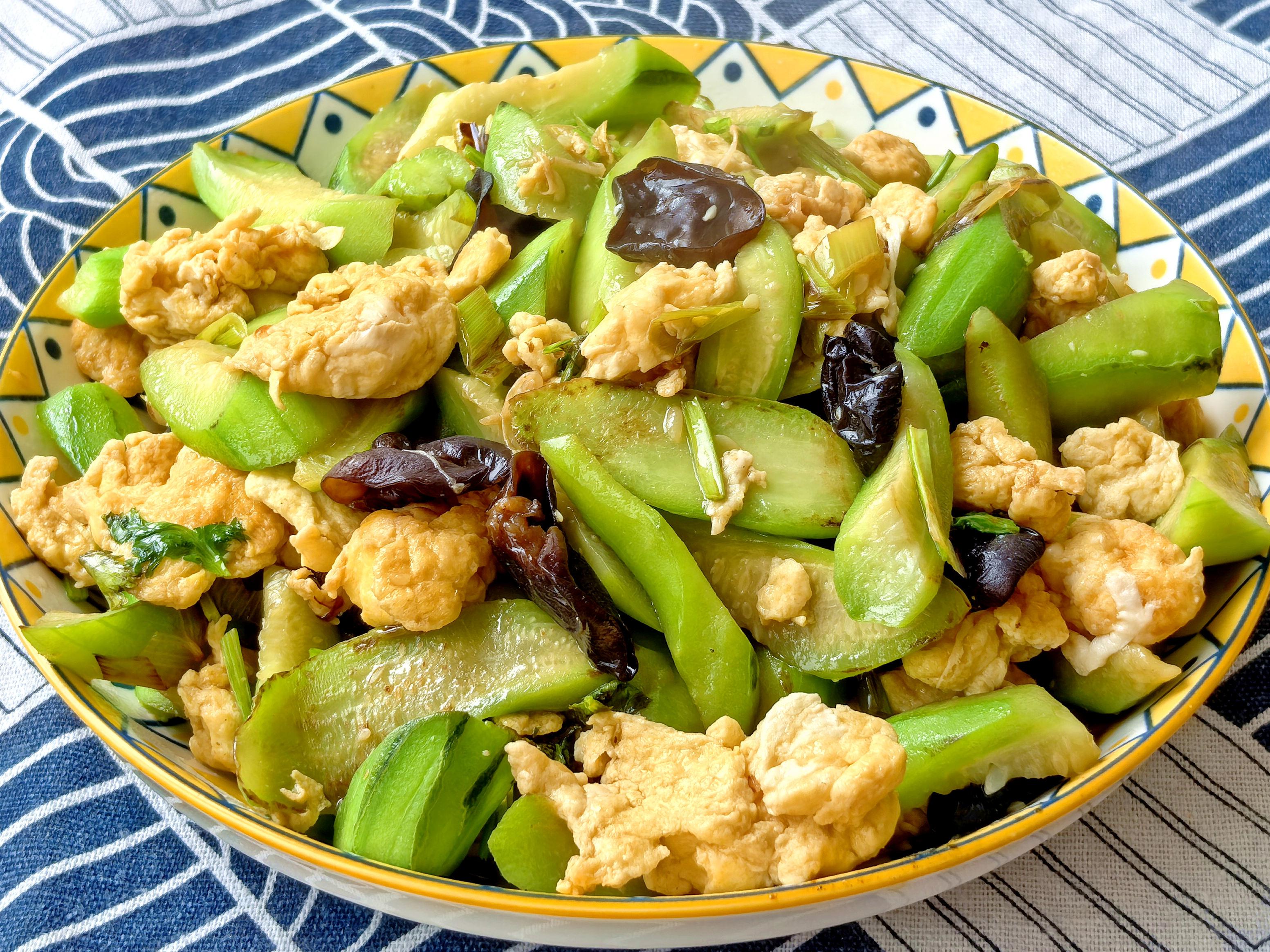 待絲瓜邊緣變軟,倒入炒好的雞蛋,加鹽調味,少許熱水沿鍋邊淋入,快速兜勻即可出鍋。絲瓜柔滑清甜,木耳爽脆,雞蛋鮮香,色澤明快,是視覺與味覺的雙重清涼。
