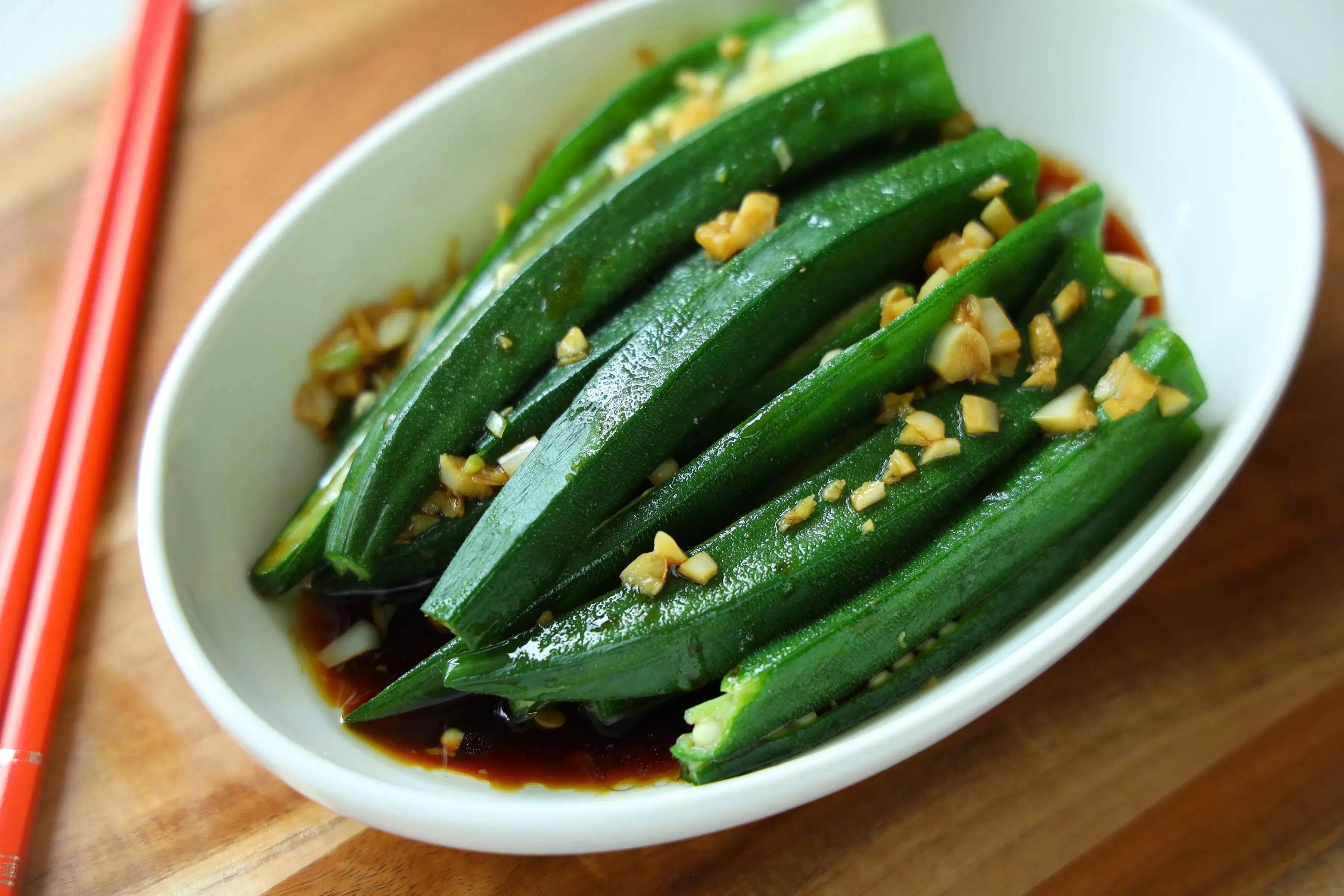 做法;1新鮮秋葵清洗,放進熱水裏焯水,水裏加入一點油,可以讓秋葵翠綠不變色