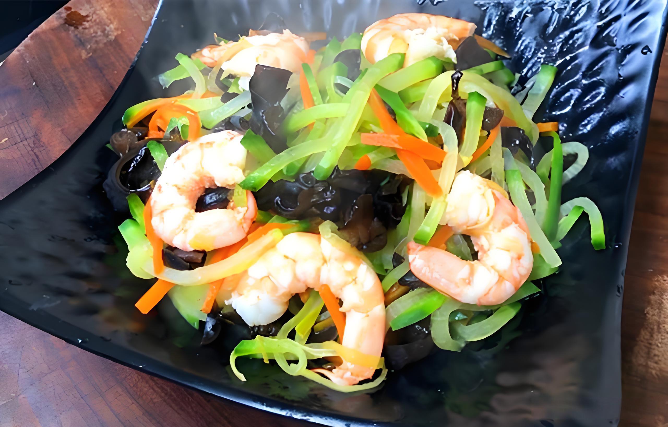 材料: 鮮大蝦10只左右,泡發黑木耳一小碗,青蘿蔔小半根,胡蘿蔔小半根,蔥白切絲少許,薑絲少許,鹽、白胡椒粉、料酒、食用油適量。