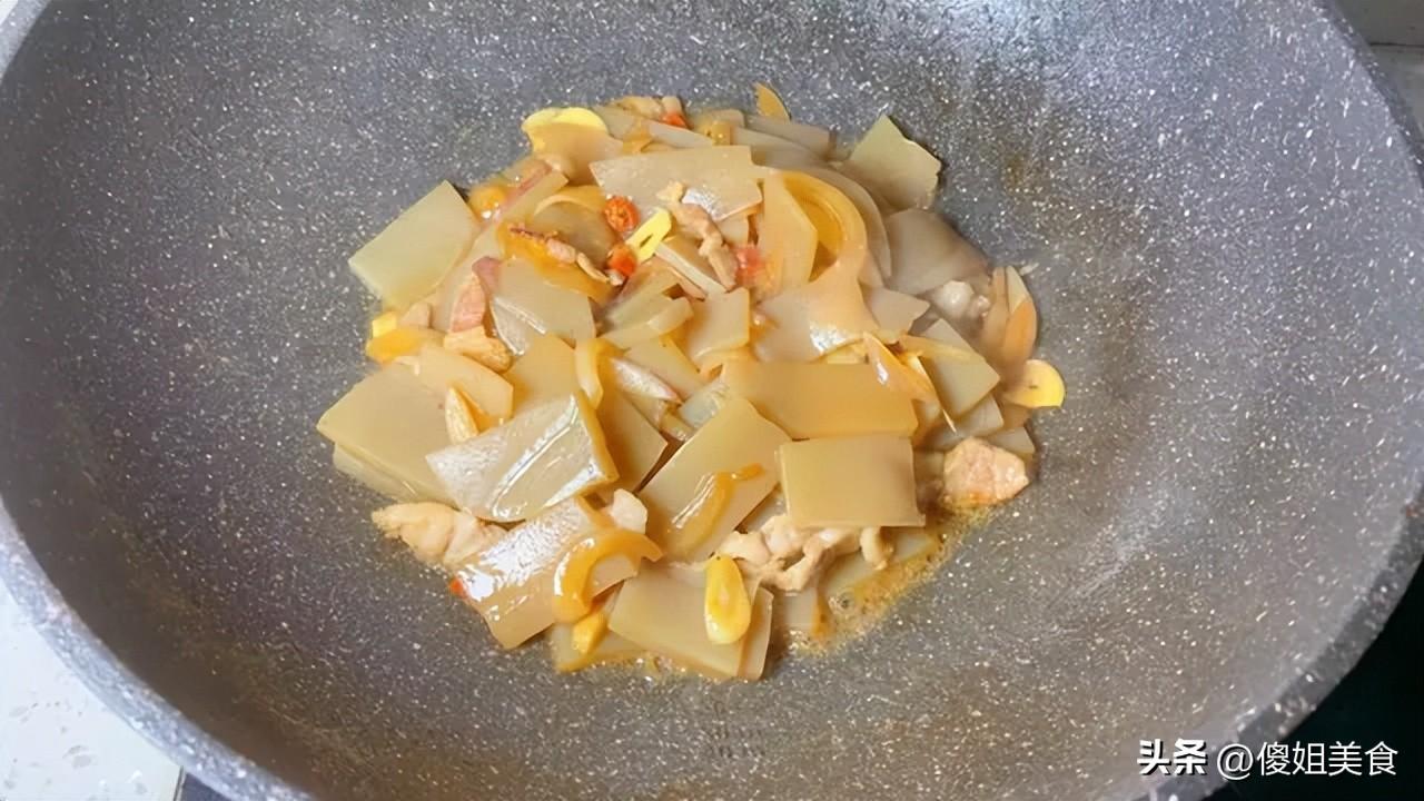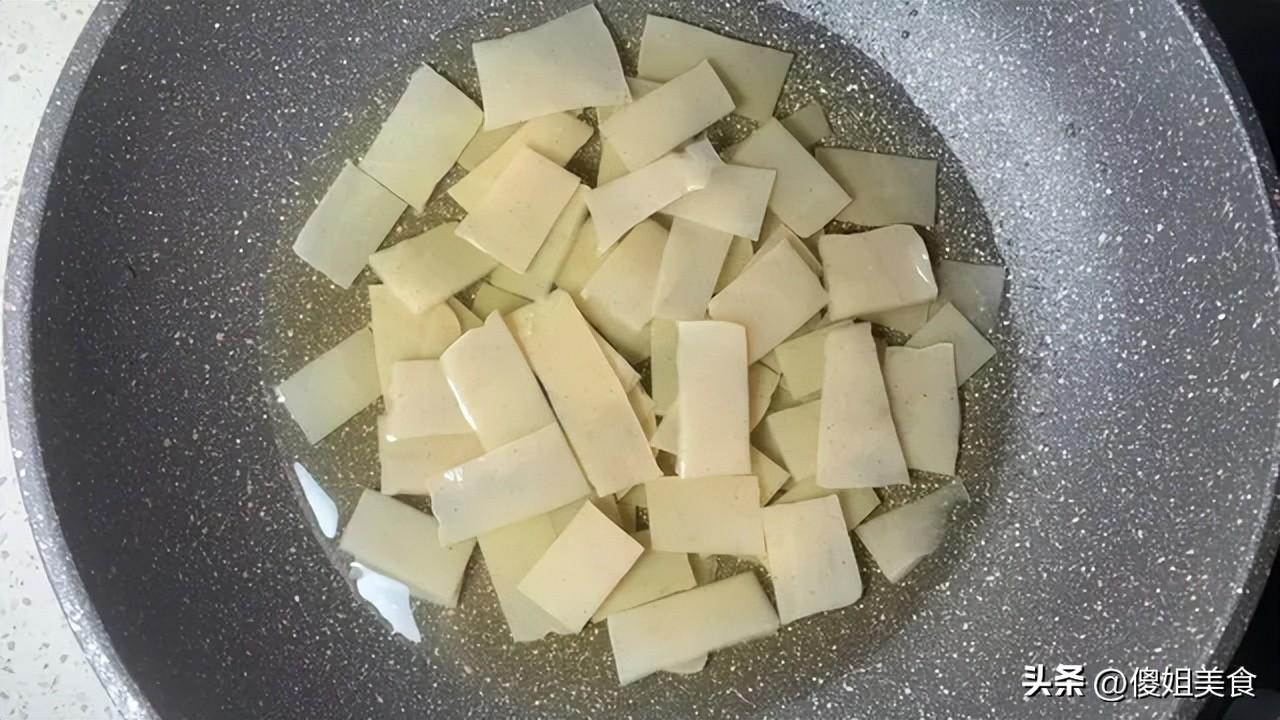 3、接下來將魔芋豆腐倒進鍋中,轉中大火,快速翻炒,讓每一塊都沾上鍋底的油香,然後淋入一勺生抽提鮮增鹹,再來半勺老抽,給整道菜染上紅亮的醬色。翻炒均勻,讓醬香充分包裹食材。