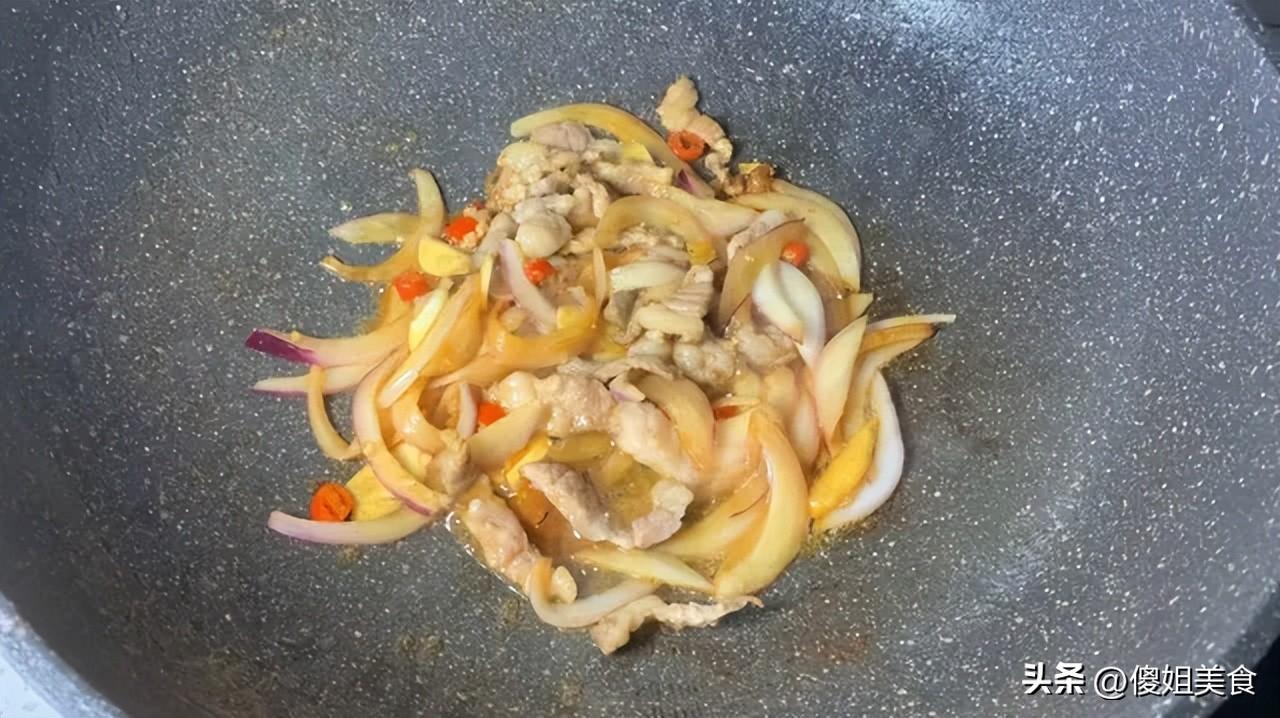 4、這時倒入洋蔥絲,繼續翻炒。洋蔥別炒太蔫,保持一點脆生生的口感最好,清甜味正好能提亮整道菜。最後根據口味撒點鹽,如果喜歡,可以加一丟丟雞精提鮮(不加也足夠美味)。快速翻勻,讓味道融合,即可出鍋。