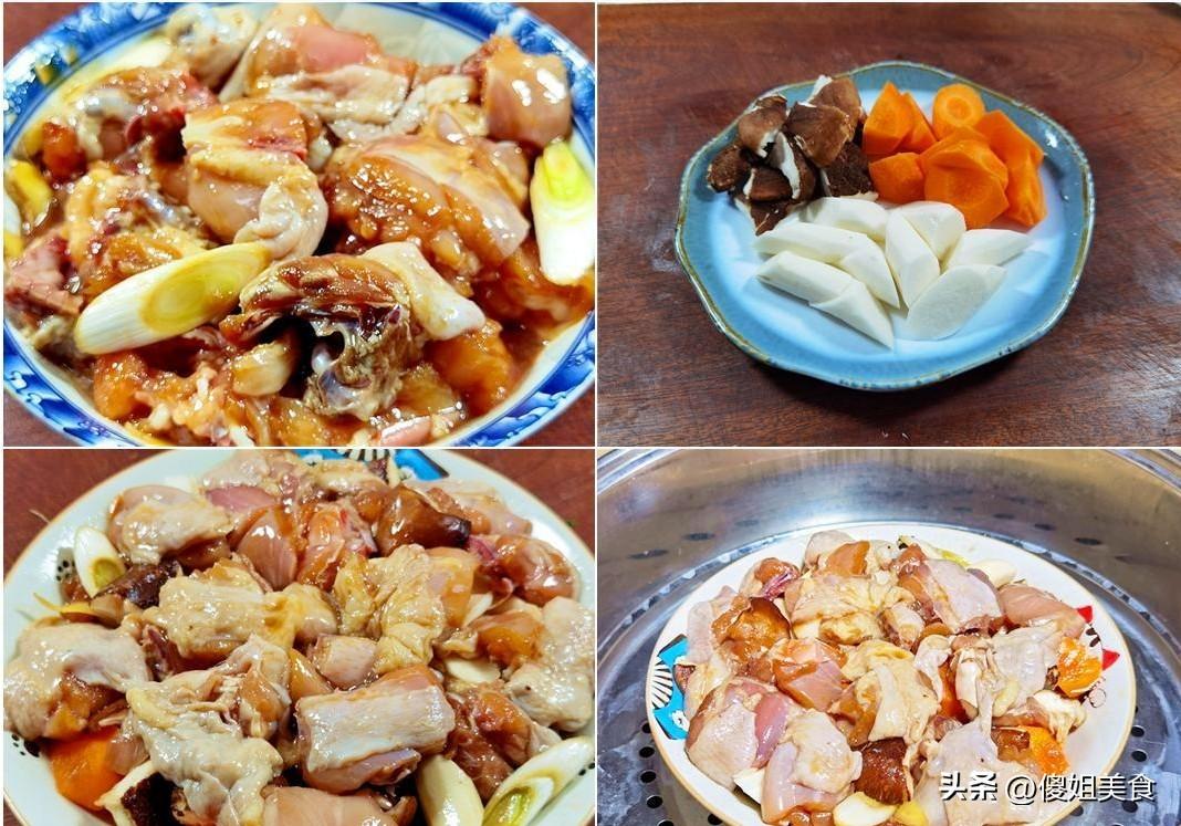 找個深盤,把山藥、胡蘿蔔、香菇鋪底,醃好的雞腿塊碼在上面。
