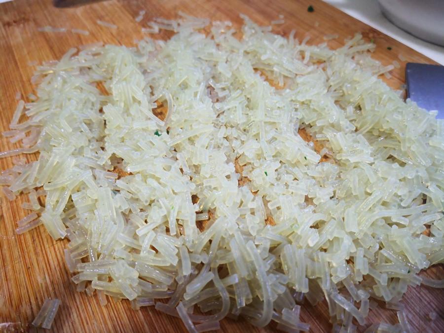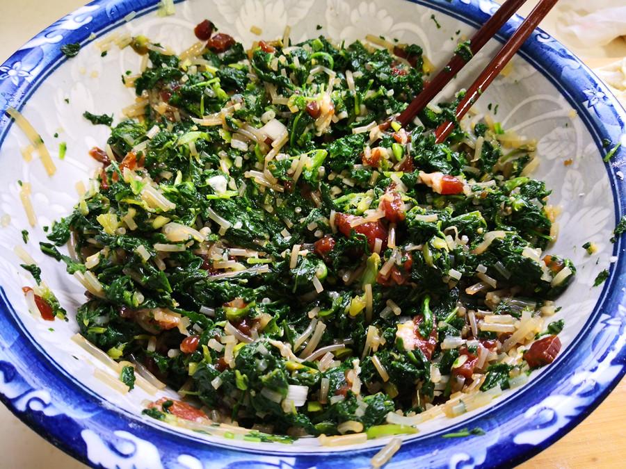 2、另一種方法先將小白菜摘去老葉,掰開後清洗乾淨,然後切碎剁細放入盆中,加入半勺食鹽攪拌均勻剎一下水分,5分鐘後擠出小白菜中多餘的水分,放入盆中備用;取一把紅薯粉條,下鍋煮軟後撈出過涼水,然後切細備用。