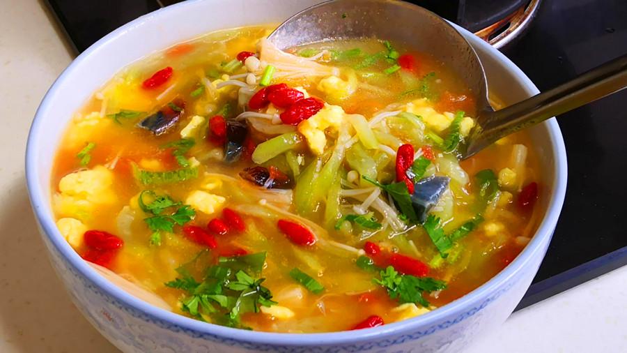 5.大火燒開後繼續煮5分鐘左右,開鍋後淋入適量的水澱粉,煮至湯汁變濃後,再加入一把泡軟的枸杞,然後加入鹽、胡椒粉、少許香油和雞精,出鍋前撒上一把蔥花和香菜,美味即成!