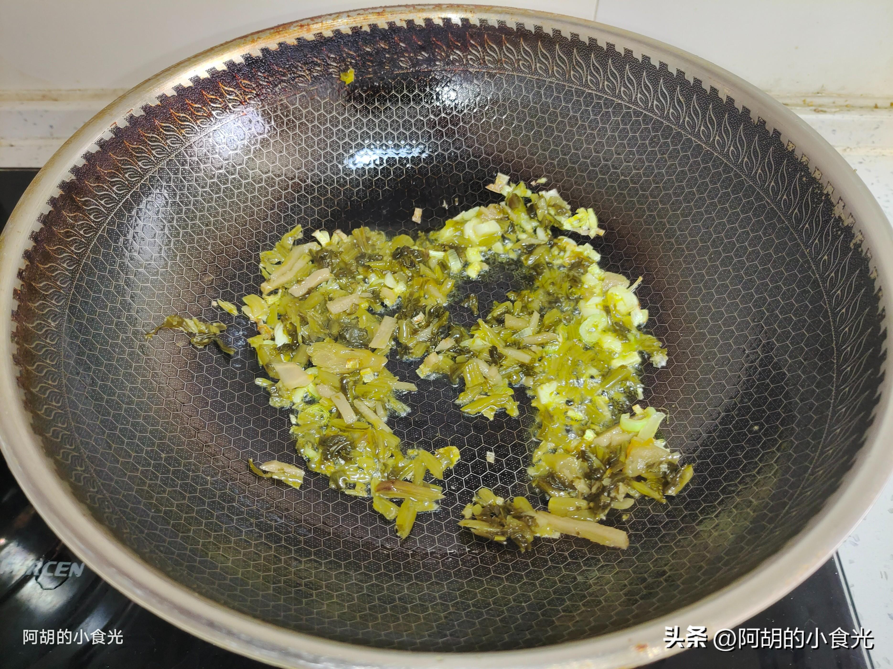 第四步:所有食材和配料準備好後就可以開火烹飪了。先把鍋燒熱,淋入一些菜籽油後小火加熱,把小料蔥蒜末倒入鍋中炒出香味,接着再把切碎的雪菜倒入鍋中炒出香味。