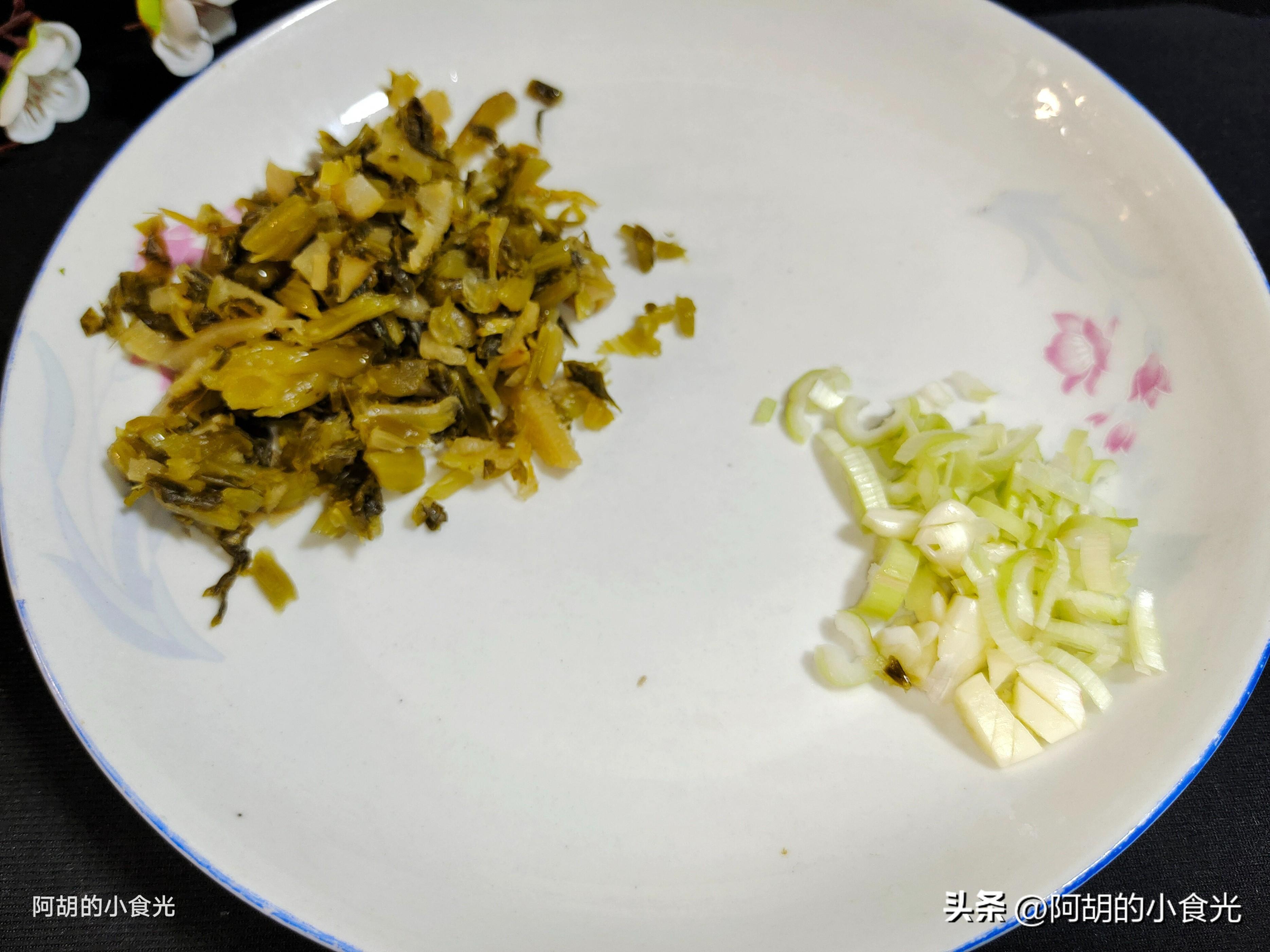 第三步:準備的配料和小料也很簡單,適量的雪菜洗掉一些鹽分後擠幹水分切碎待用。適量的蔥蒜末作爲小料使用。