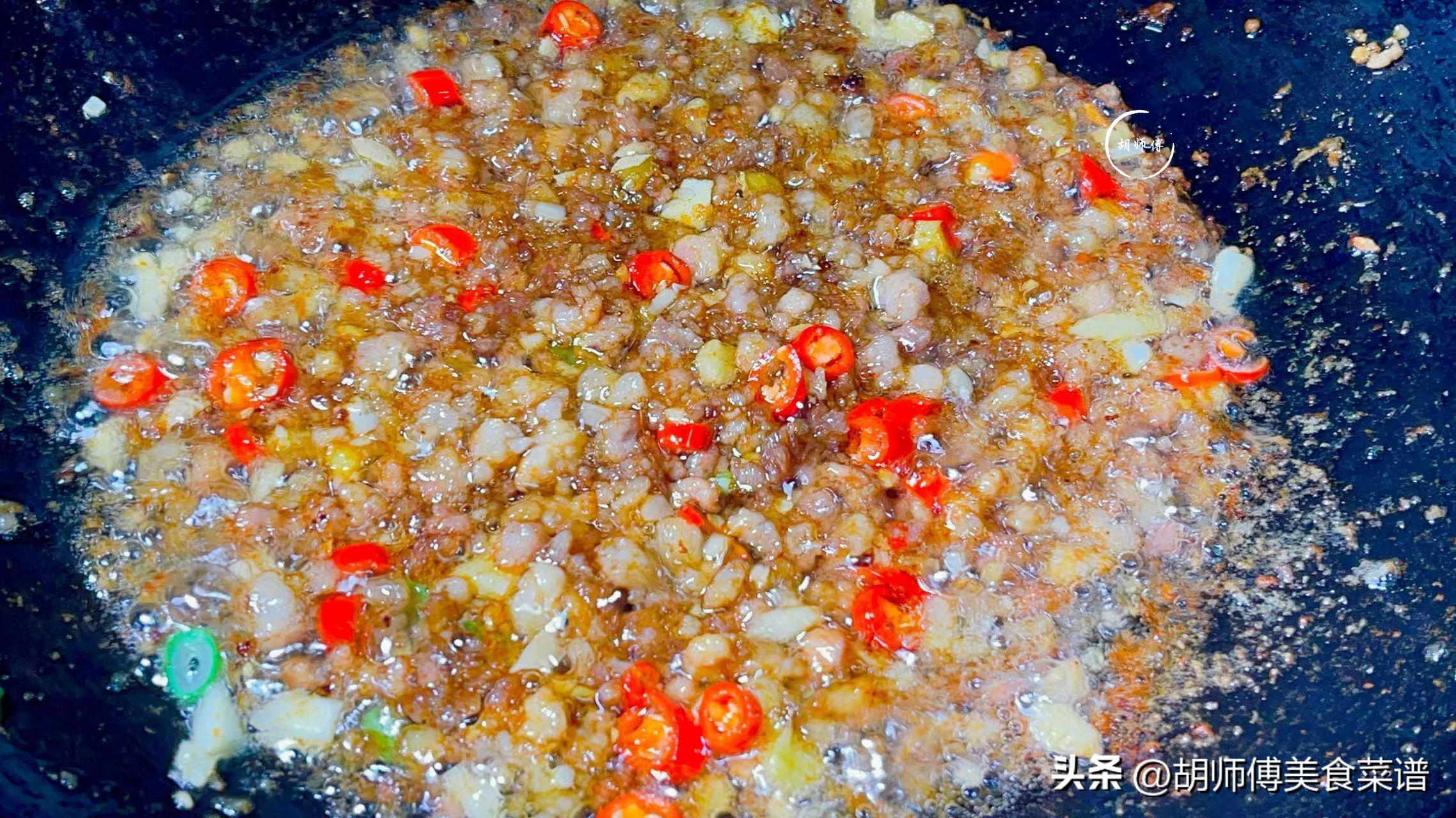 第二步:鍋中放入適量油,等油燒熱後,把肉末、薑末全部放入鍋中,將肉糜炒成淺黃色後,把小米椒、蒜末、蠔油放入鍋中炒幾下,這樣可以增加肉末的香味。