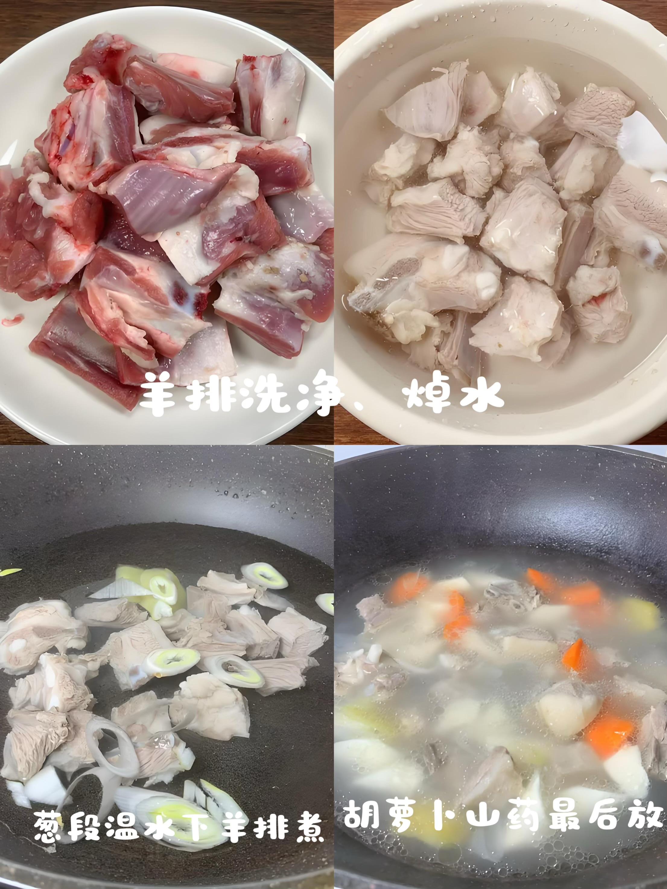 1、羊排剁塊,冷水下鍋!丟兩片姜、倒一小勺料酒。大火燒開,看到浮沫就耐心撇乾淨,撈出來用溫水衝乾淨。這一步別偷懶,羶味去幹淨湯纔好喝。