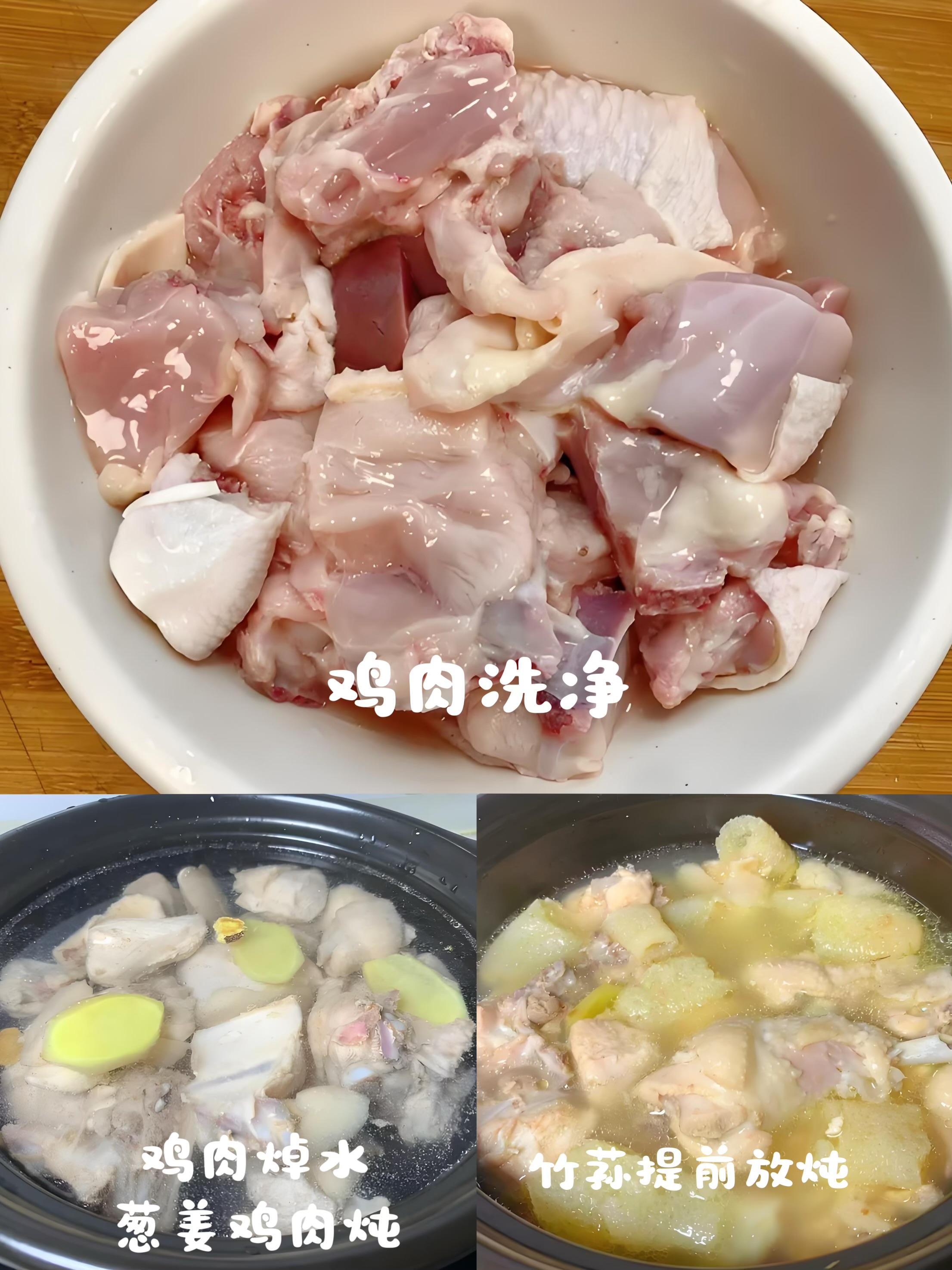 3、焯好的雞塊放進鍋裏,加足量熱水、幾片姜。大火燒開轉小火,蓋蓋燉個40-50分鐘,雞肉軟爛就行。