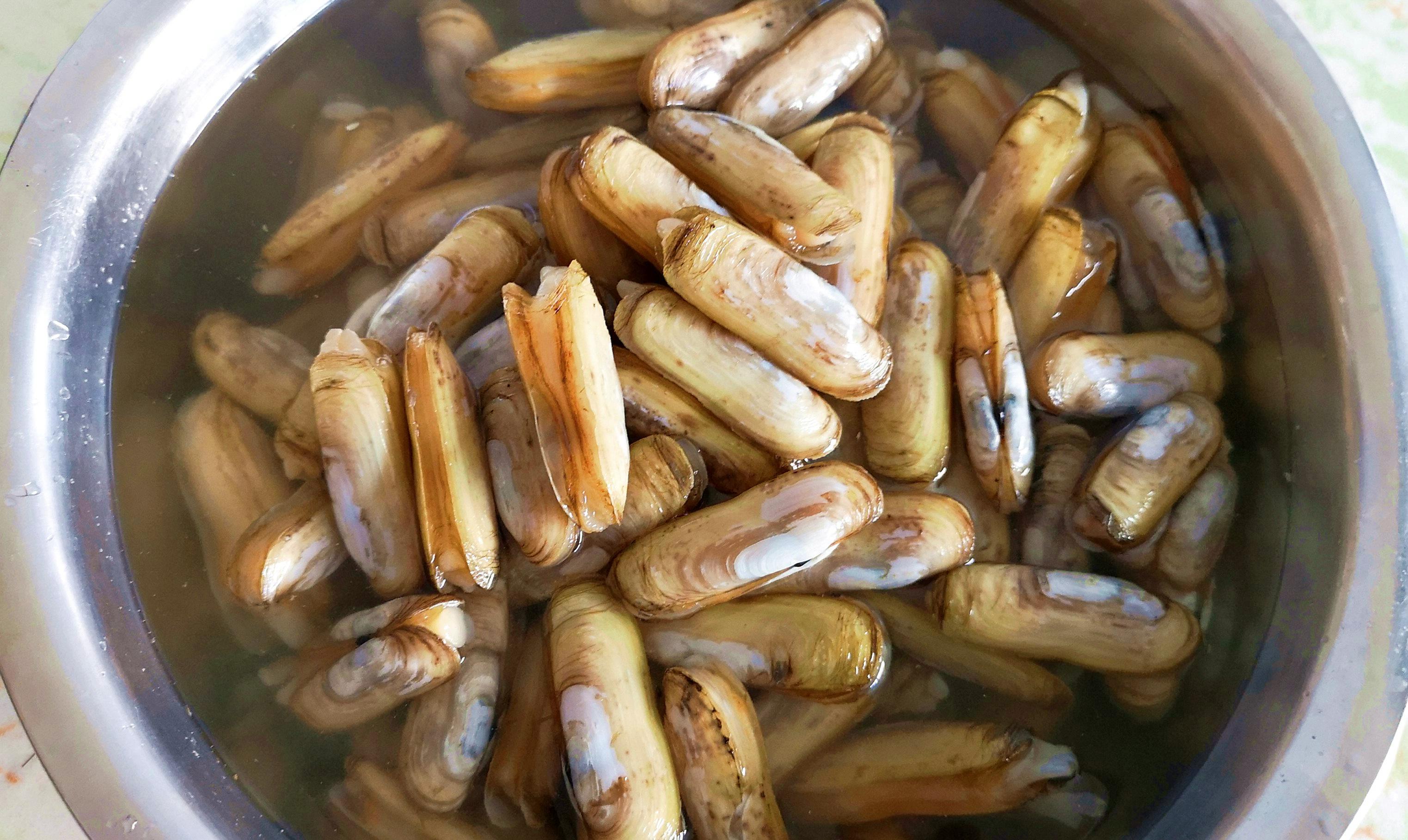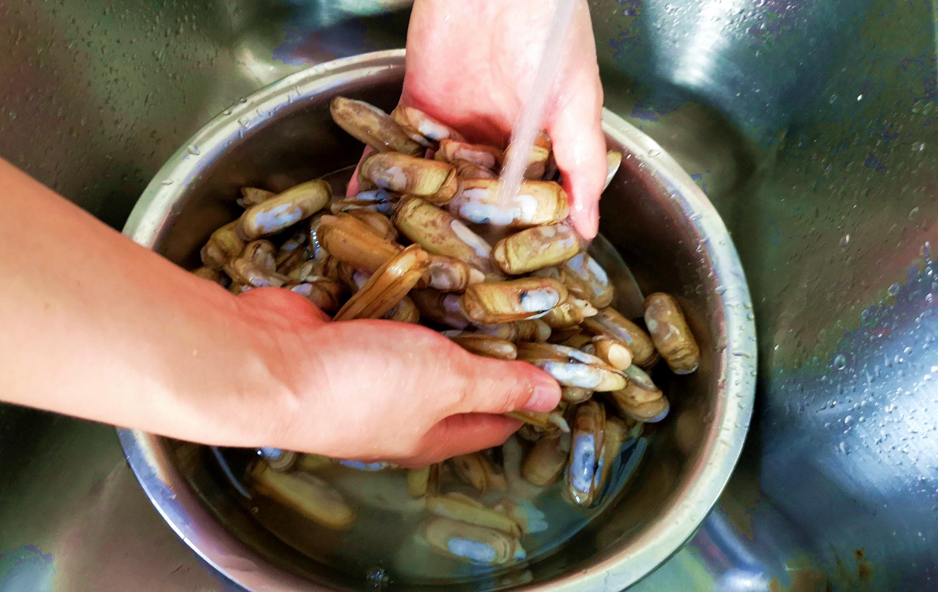 4、清洗: 時間一到,將蟶子撈出,置於流動的清水下,用手輕輕搓洗外殼,尤其注意搓掉吸水管附近可能附着的少量黏液。此時再剪開一個檢查,內壁乾淨清爽,幾乎找不到沙粒的蹤跡。