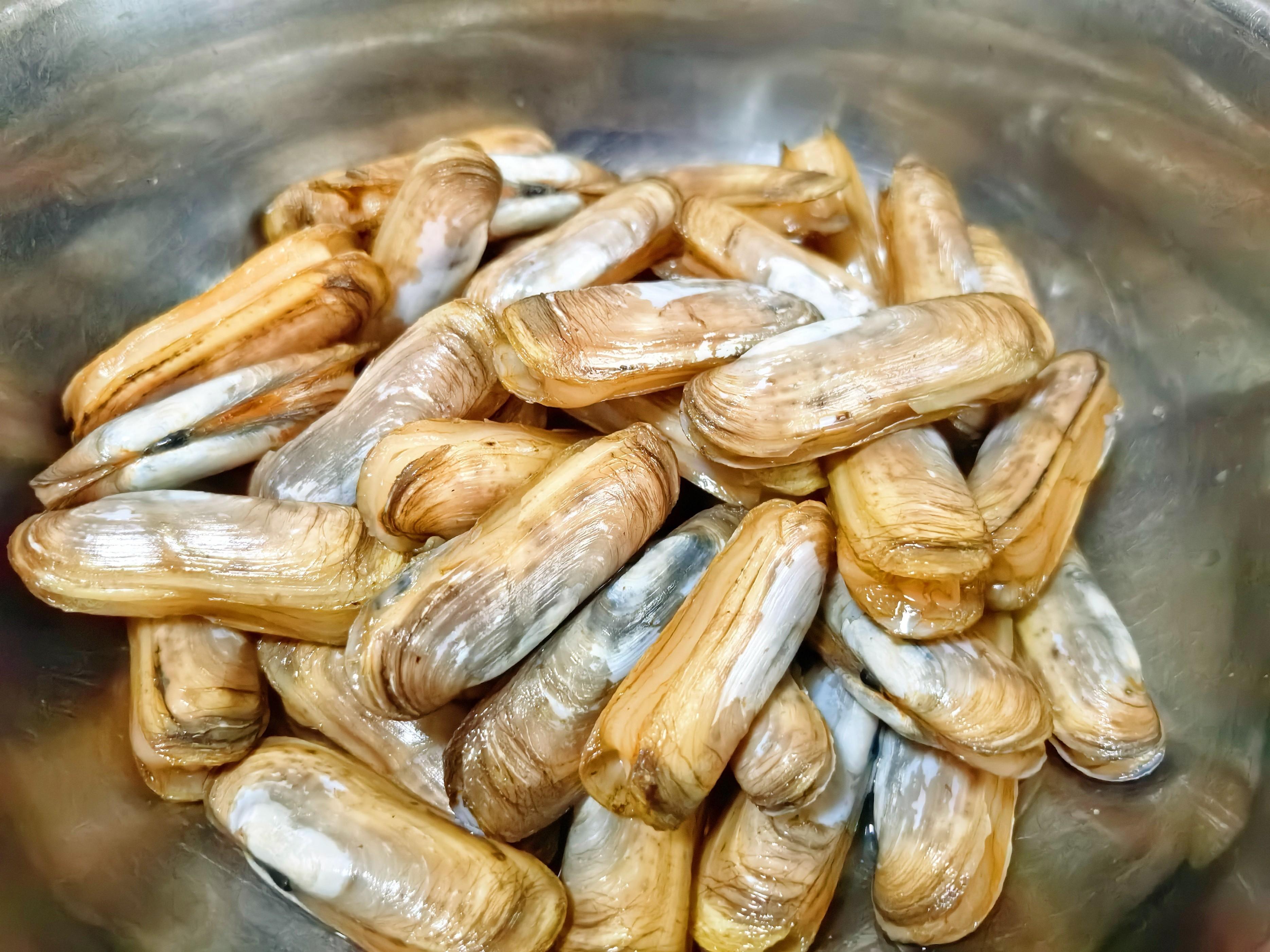 2、靜置: 將新鮮買回的蟶子輕輕倒入這盆溫水中。奇妙的事情旋即發生:溫水溫柔包裹,彷彿傳遞着海水漲潮的信號,蟶子們如同聽到了故鄉的召喚,感知到環境舒適安全,很快便鬆弛下來,紛紛探出那根肉管子(水管),舒暢地開合吞吐。