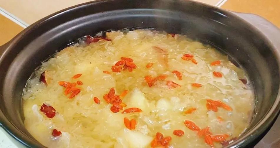 2、將雪梨塊與銀耳一同放入鍋中,加入適量的清水,再加入少許冰糖,當雪梨變得晶瑩剔透,銀耳也變得軟糯時,便可關火。冷卻過後,便可出鍋食用。
