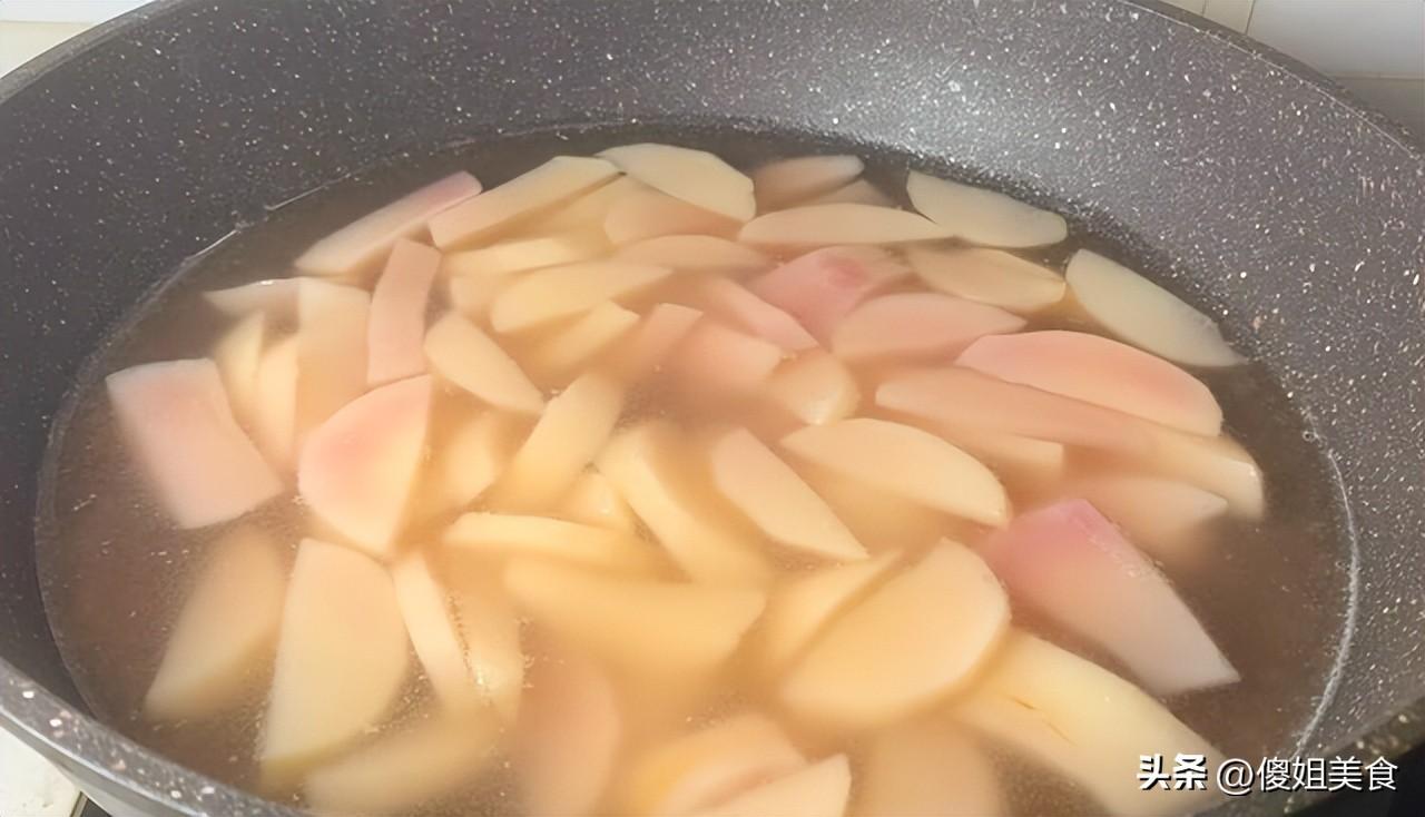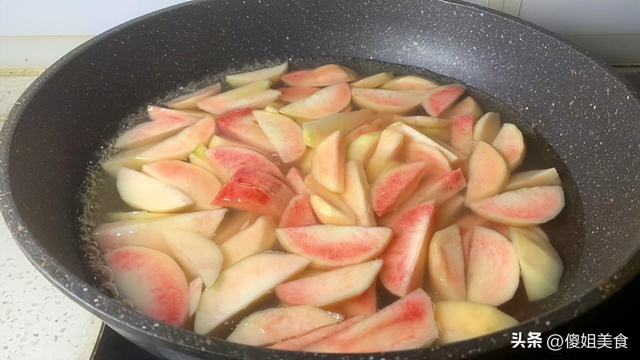 2、鍋中放入桃塊,加清水剛好沒過桃肉,根據口味加入冰糖(一般1斤桃配80克糖)。再加一小撮鹽——這是讓甜味更突出的祕訣!