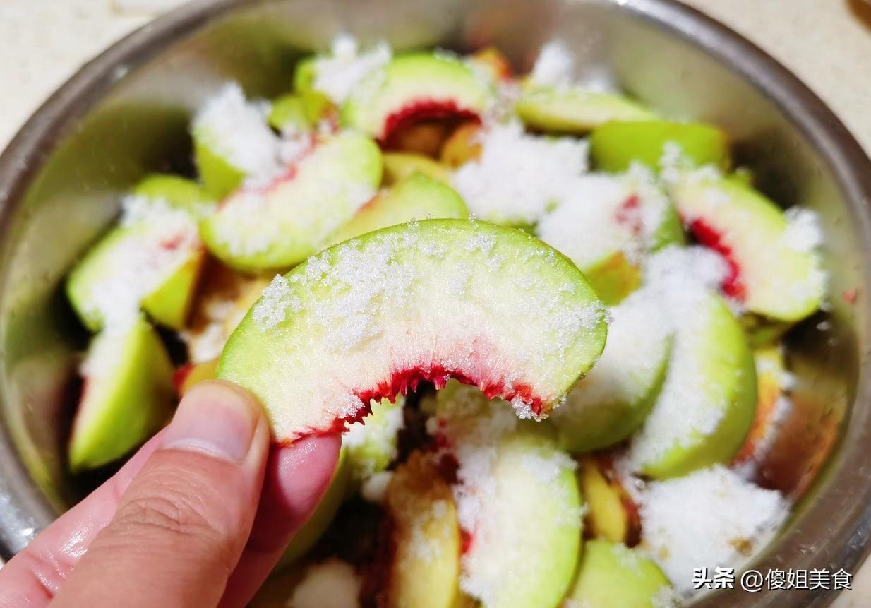 3、連桃肉帶醃出來的汁水,一股腦兒倒進鍋裏(最好是不粘鍋)。開中火煮開,然後轉小火慢慢咕嘟。關鍵在這裏: 別煮太爛!看到桃肉變得有點半透明,用筷子戳一下能輕鬆戳透,但還保持形狀,鍋裏的糖水也變得黏稠、亮晶晶的,咕嘟咕嘟冒大泡泡(像圖片裏那樣),就趕緊關火!整個過程大概15-20分鐘,要時不時攪和一下,防止粘鍋底。