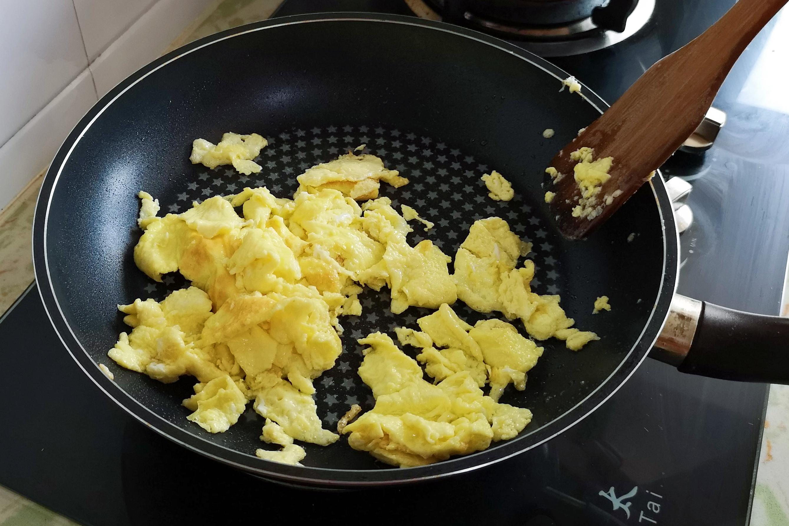 1、鍋燒得足夠熱,直到微微冒煙。倒入比平時炒菜稍多一點的食用油(苦瓜喜油),油溫要高,燒至油麪波動、微微有煙的狀態。把雞蛋液倒進鍋裏,雞蛋葉定型後再翻炒,翻炒熟後盛出備用。