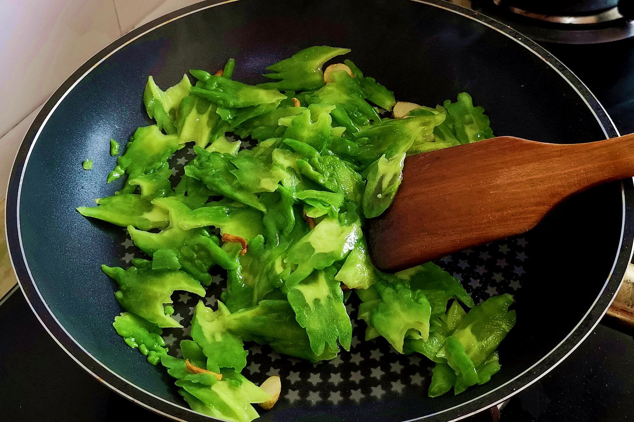 2、鍋留底油放蒜粒炒香,攥幹水分的苦瓜片立刻倒入鍋中,只聽"滋啦"一聲!全程保持最大火力,快速顛勺翻炒。這猛火快炒,正是鎖住水分、保持翠綠與脆嫩的不二法門。苦瓜片在鍋中跳躍,顏色愈發鮮亮。