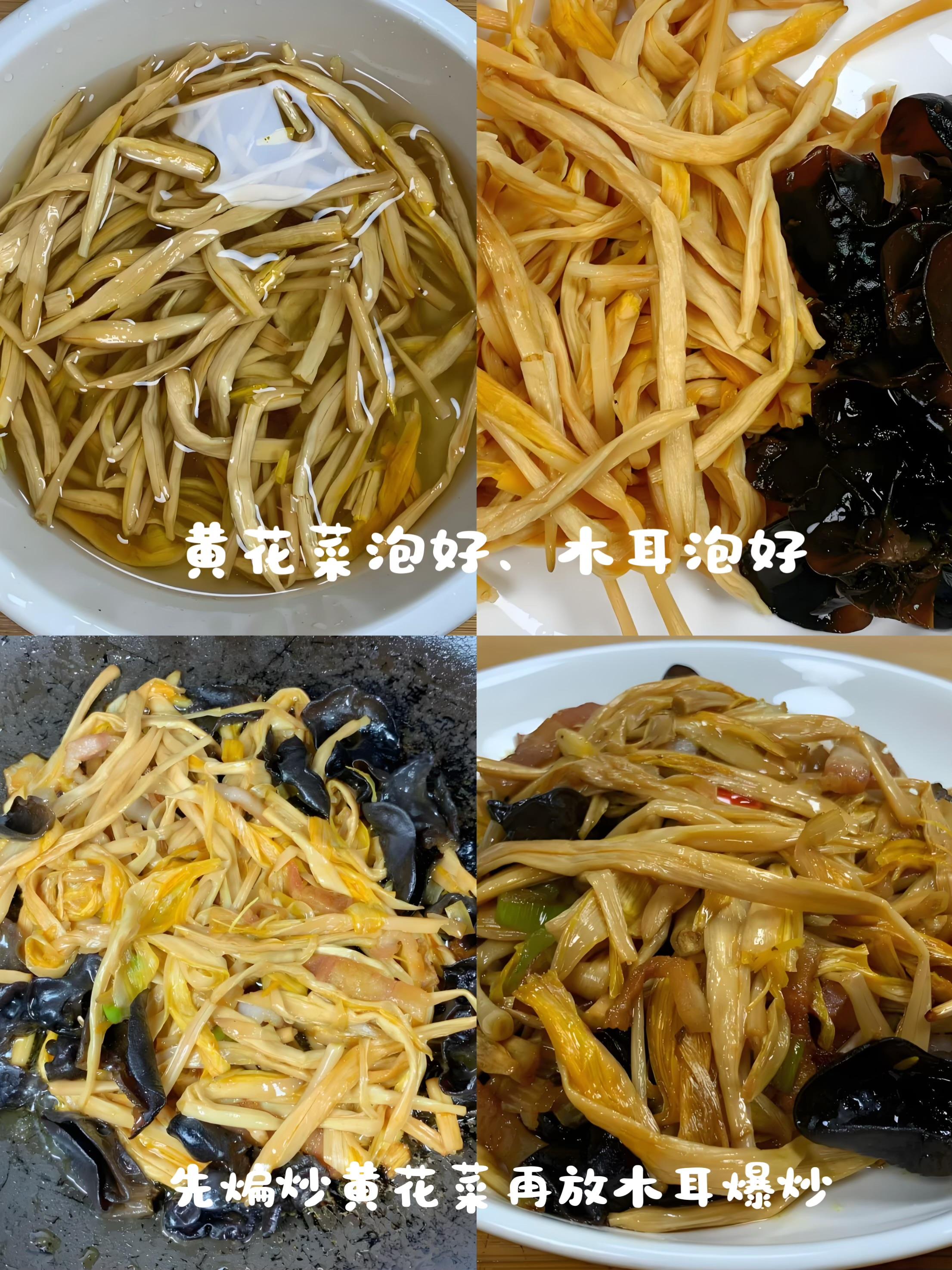 5、加小半碗清水或者高湯,水量不用多,剛能潤一下鍋底食材就好。蓋上鍋蓋,轉中小火燜個2-3分鐘,讓黃花菜和木耳吸飽味道。