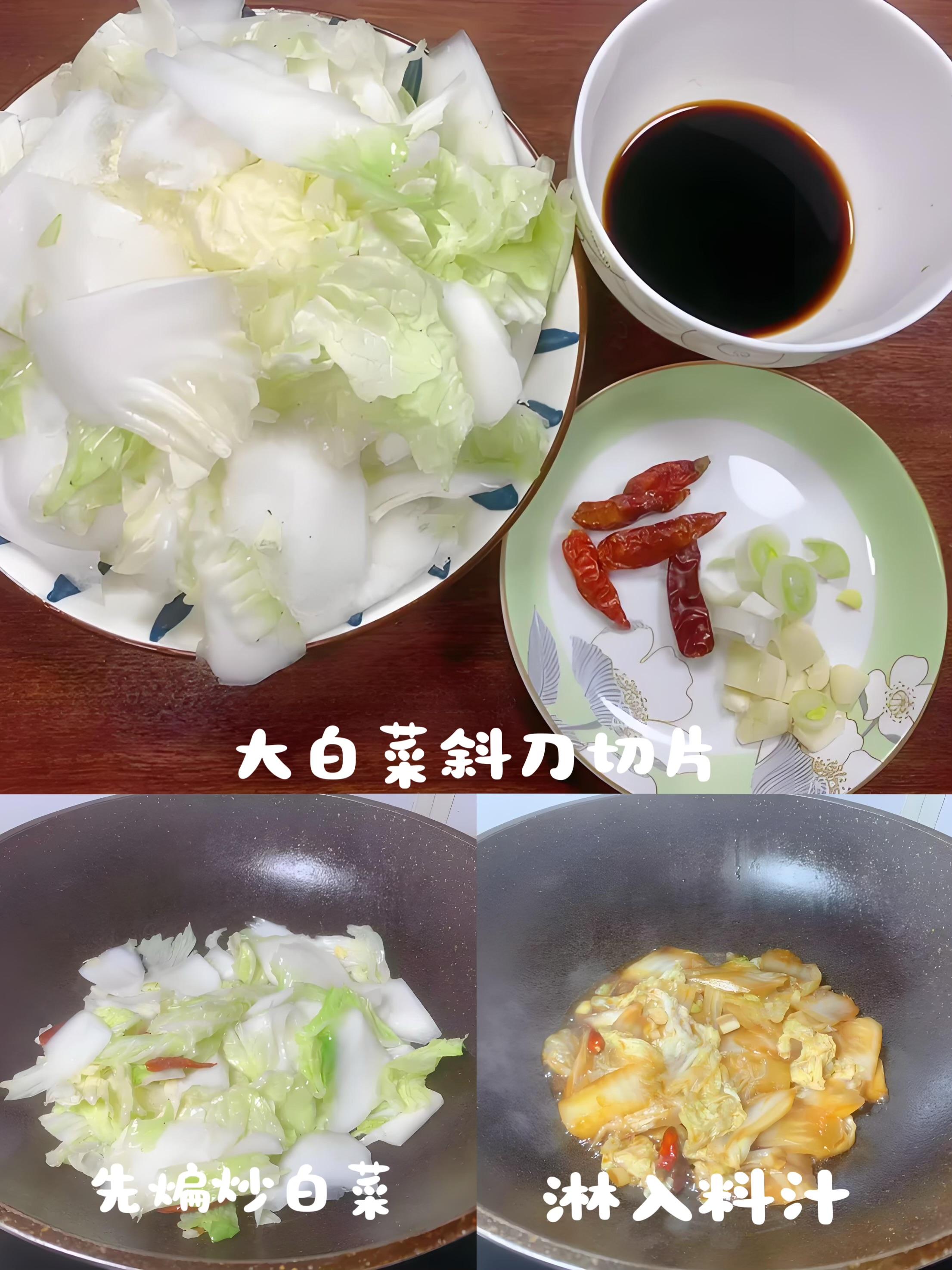 5、炒到白菜整體變軟了,但還保留一點脆勁兒,鍋底也沒什麼多餘湯汁了,就可以關火出鍋啦!