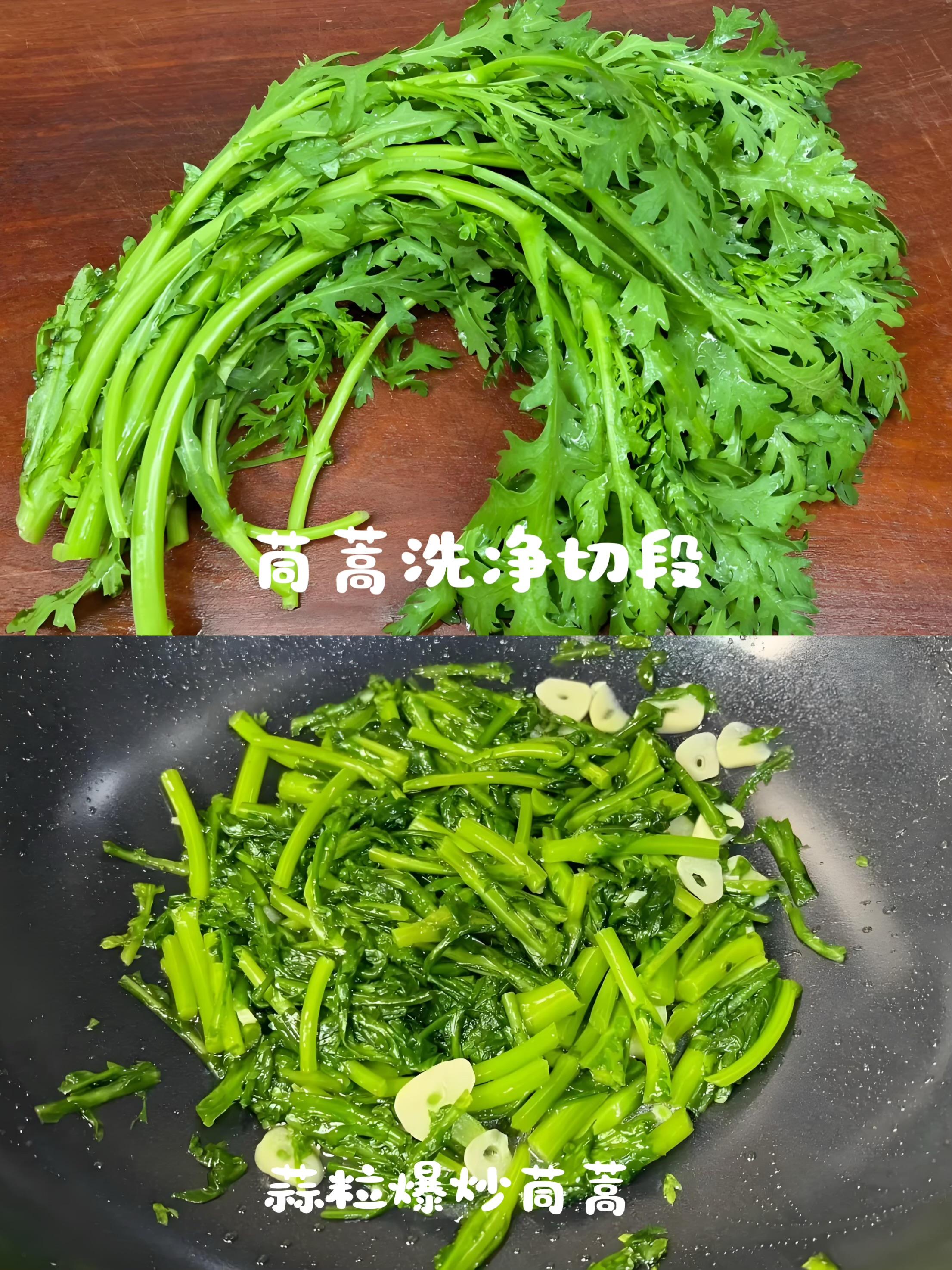 2、把茼蒿段一股腦倒進鍋裏,轉大火! 快速翻炒,讓熱油和蒜香一下子裹住每一根茼蒿。