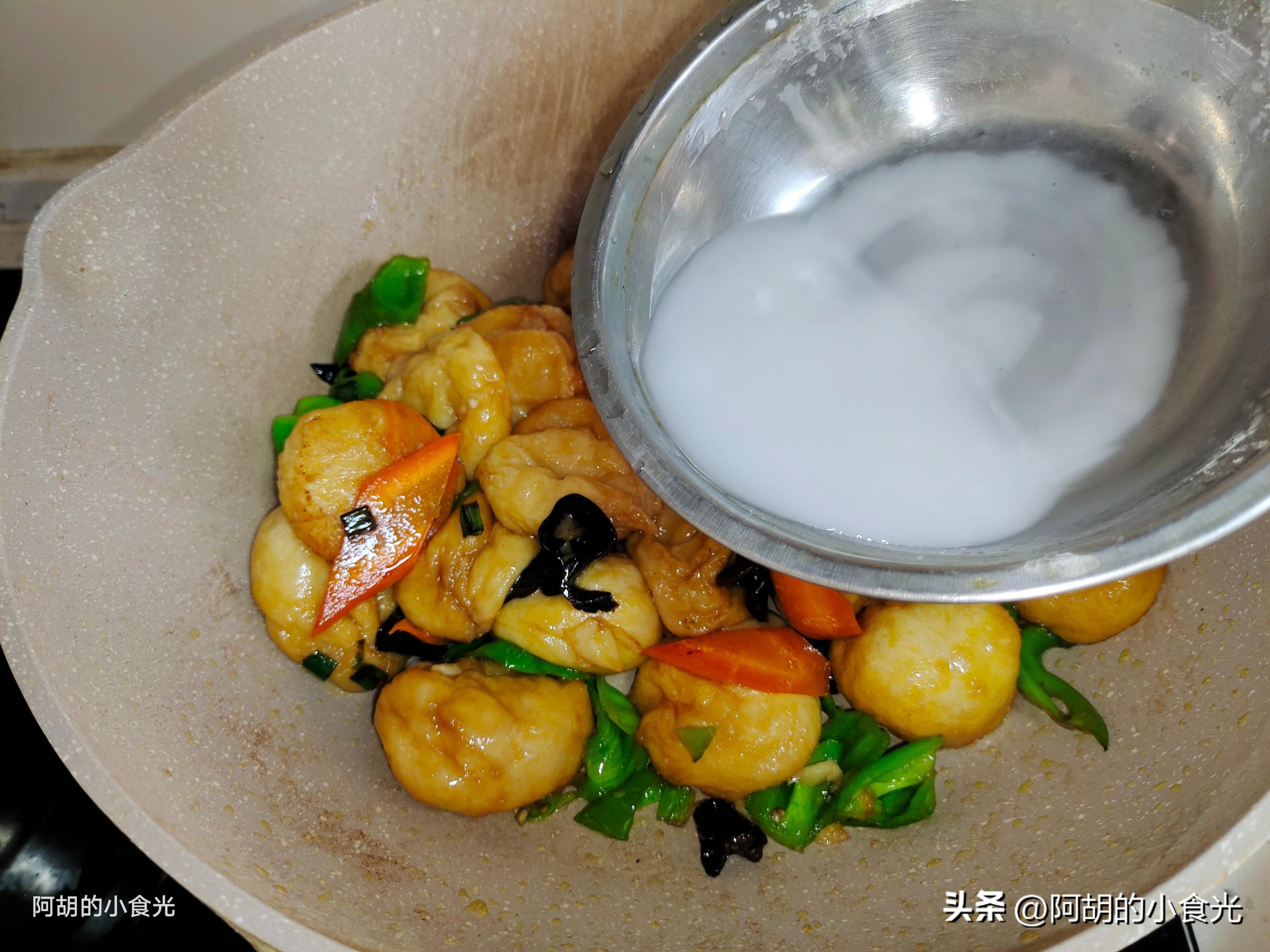 第六步:最後撒入一些食鹽和松茸鮮,保持大火繼續翻炒均勻。再用涼水稀釋一些幹澱粉攪拌均勻,保持大火直接淋入鍋內,再次翻炒均勻後就可以出鍋裝盤了。一道特別簡單的快炒素菜,油麪筋軟嫩入味,開胃又下飯,不知道喫什麼的時候不妨試一試這個做法。
